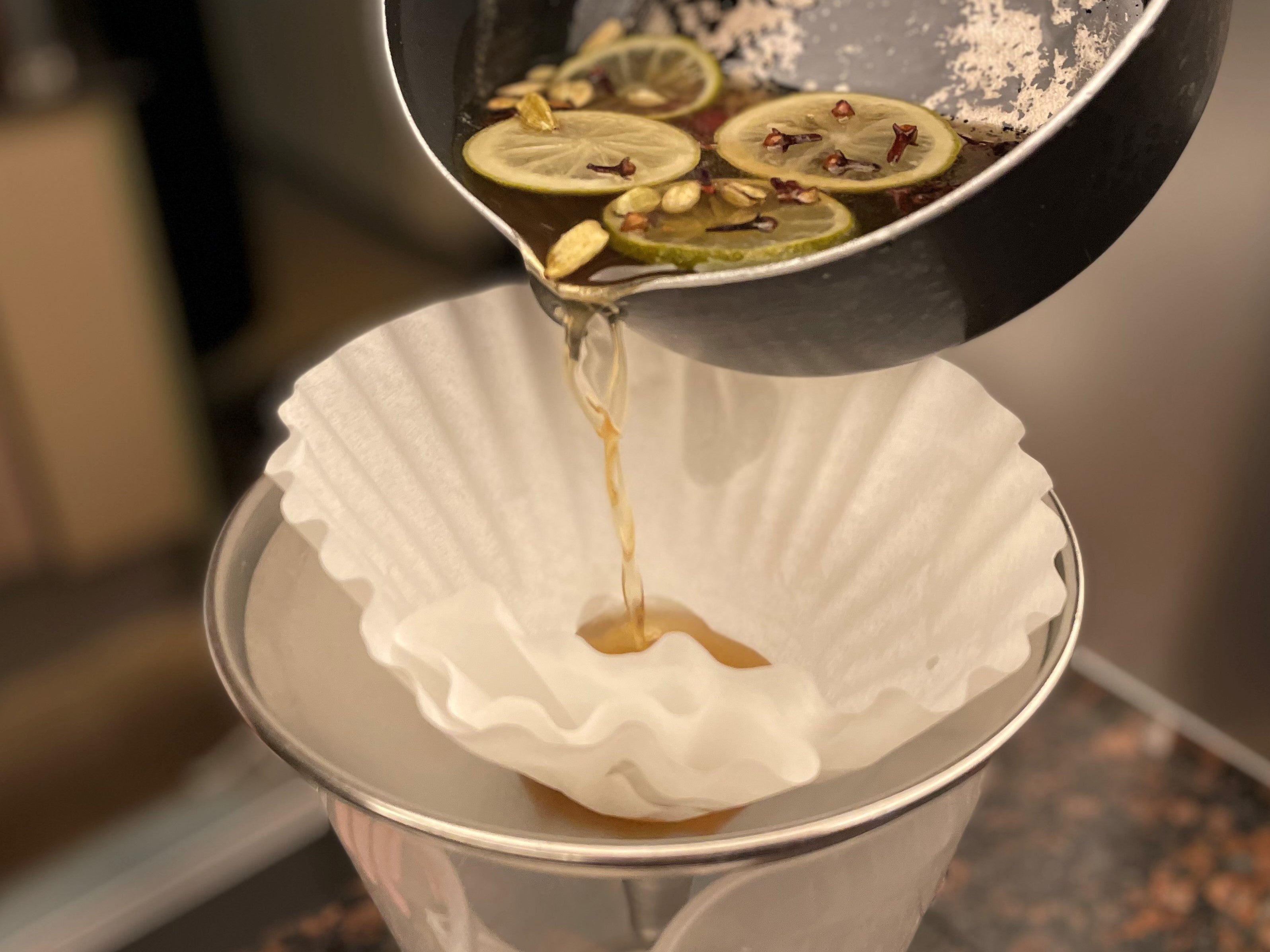 そこに砂糖を加え粗熱を冷ましてから冷蔵庫で寝かし、約1日冷やしたあとコーヒーフィルターで漉すと、甘味とスパイス特有の辛味を感じる「ビアスパイスシロップ」が出来上がります。