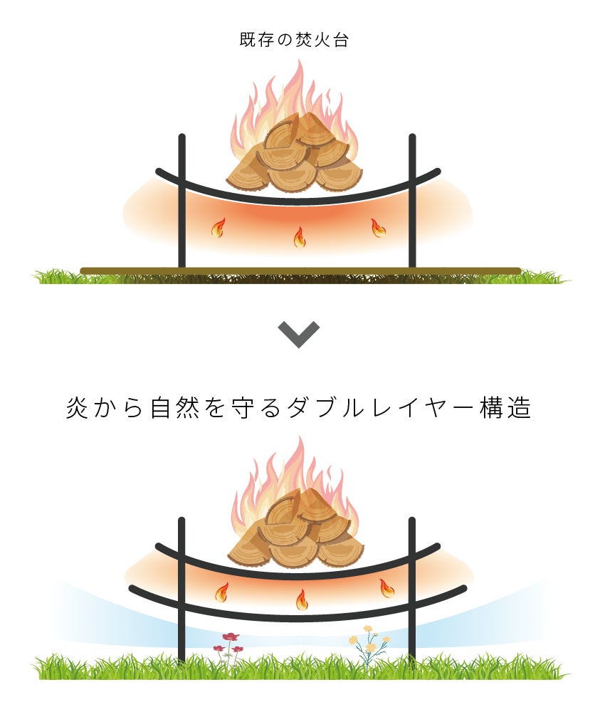 we know enough< の焚火台は火床に加えて、灰受けプレートを設置するダブルレイヤー構造により、火の粉から地面の草花を守ります。灰受けプレートを地面から浮かせ、空気層を設けることで、風の通り道を作り、地面や草花への影響を極力少なくすることを可能にしています。