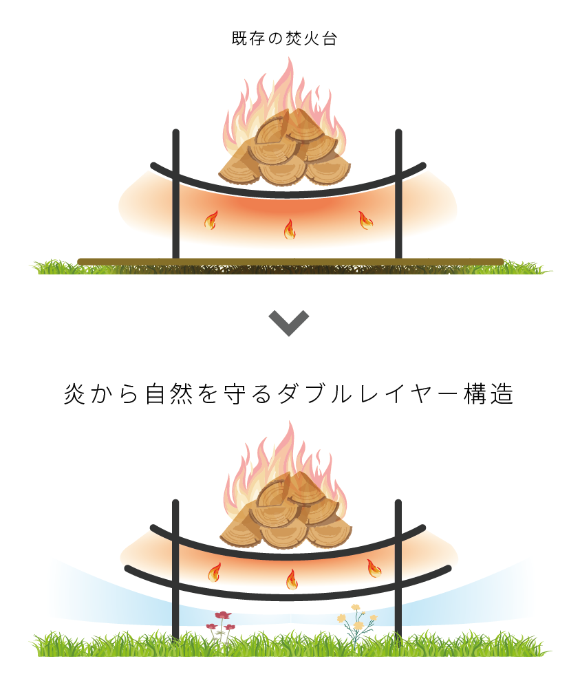 we know enough< の焚火台は火床に加えて、灰受けプレートを設置するダブルレイヤー構造により、火の粉から地面の草花を守ります。灰受けプレートを地面から浮かせ、空気層を設けることで、風の通り道を作り、地面や草花への影響を極力少なくすることを可能にしています。