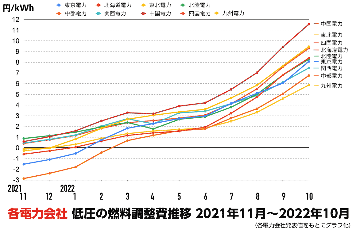 2021年の秋以降、電気代は上昇の一途をたどっています。原因は、石炭や液化天然ガス(LNG)などの輸入価格高騰の影響で、燃料費調整額が値上げされているためです。そこで、日本各地の東京電力の燃料調整費推移(低圧)をグラフにしました。しかも、2022年内には、これの上限撤廃の動きがあり、さらなる電気代の上昇が予想されます。近年、毎年のように台風や局地的な大雨、地震災害による痛ましいニュースがあります。災害時には数日から数週間にわたる停電が起こってしまうことも事実です。もしもの緊急時のために電力を備えておくこと。また、持ち運び可能なソーラー充電パネルでの発電は、災害時に大きな力となります。