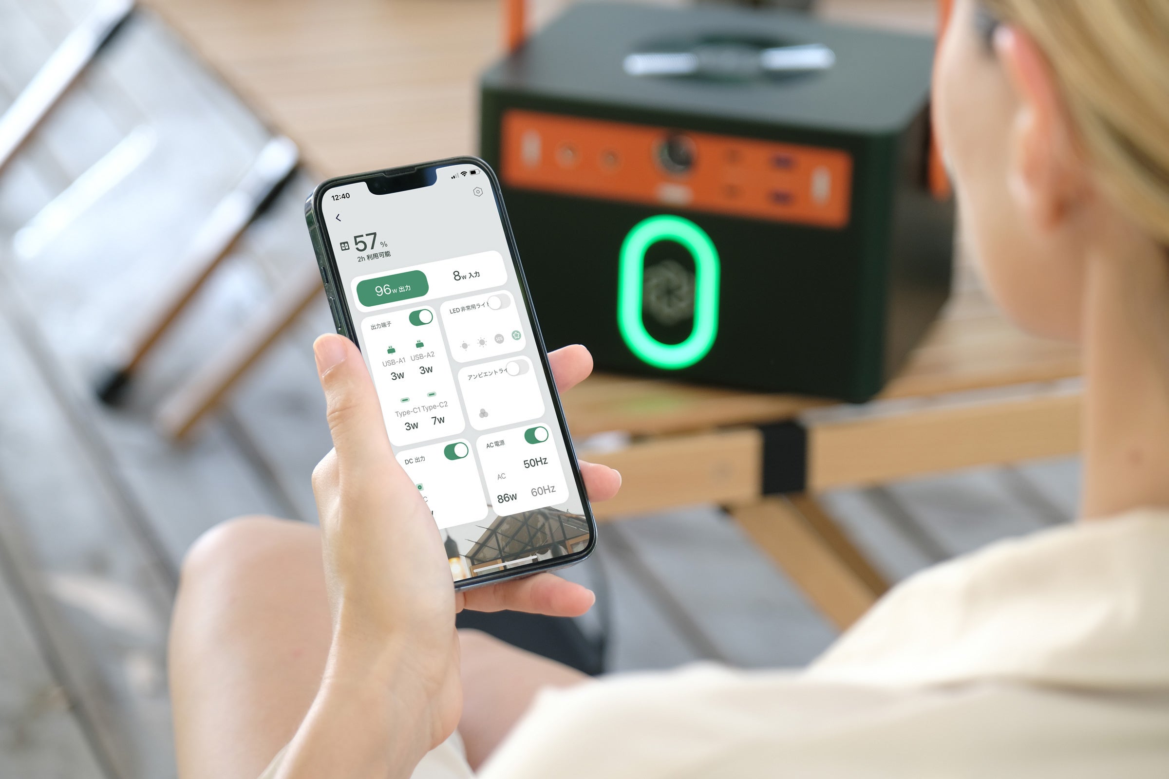 - スマートフォン用アプリ|充電状況、バッテリー残容量などをリアルタイムでのモニタリング、環境光LEDのコントロール、出力のオン・オフなどに対応します。