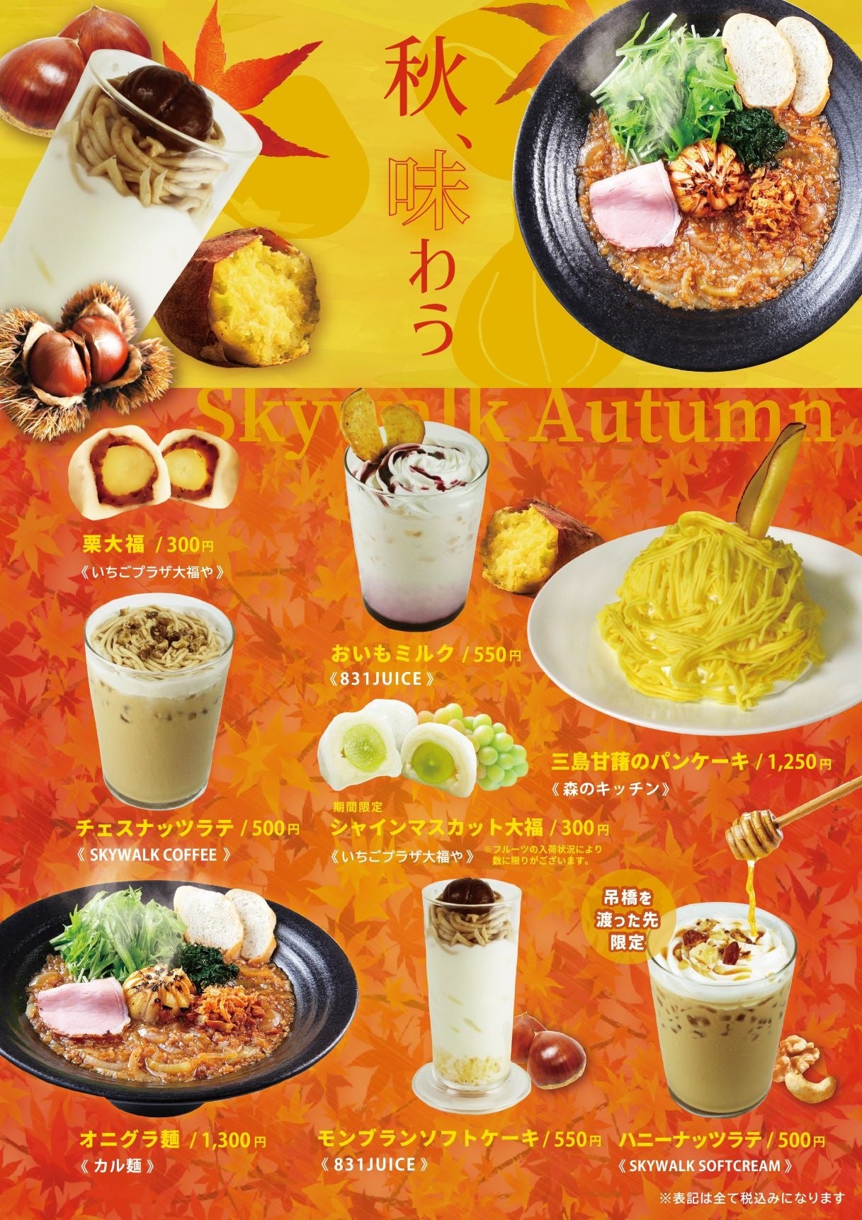 また、施設内の各店舗にて、秋限定メニューを販売中です。箱根西麓三島野菜の三島甘藷をたっぷり使用した「三島甘藷パンケーキ」や、冷えた体が温まる「箱根西麓三島野菜のオニグラ麺」など、秋ならではおすすめのメニューをご用意しております。