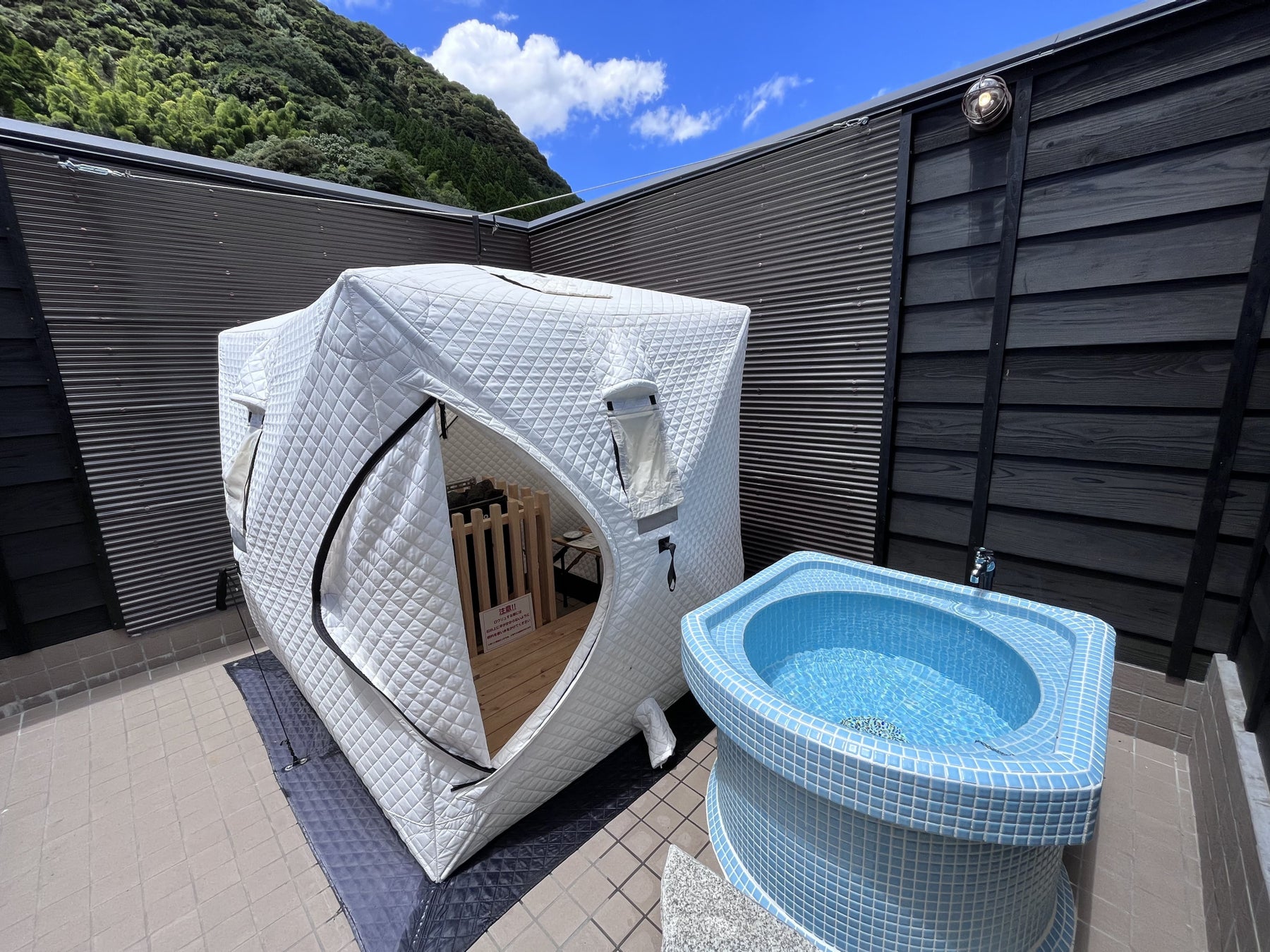 そして、日本初の全室プライベートルームに源泉掛け流し露天風呂を有しているグランピング施設を併設。湧き水を利用した水風呂、テントサウナ(スイートグランピングに設置)とあわせてご利用いただけています。