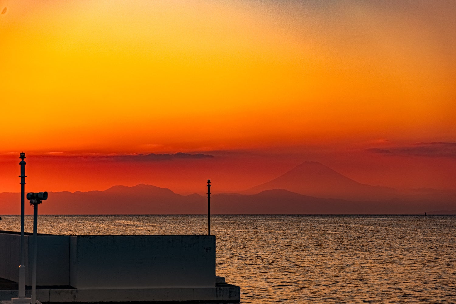 ④海の絶景サウナでととのう。マリーナから広がる海越しの富士山を眺めながら外気浴