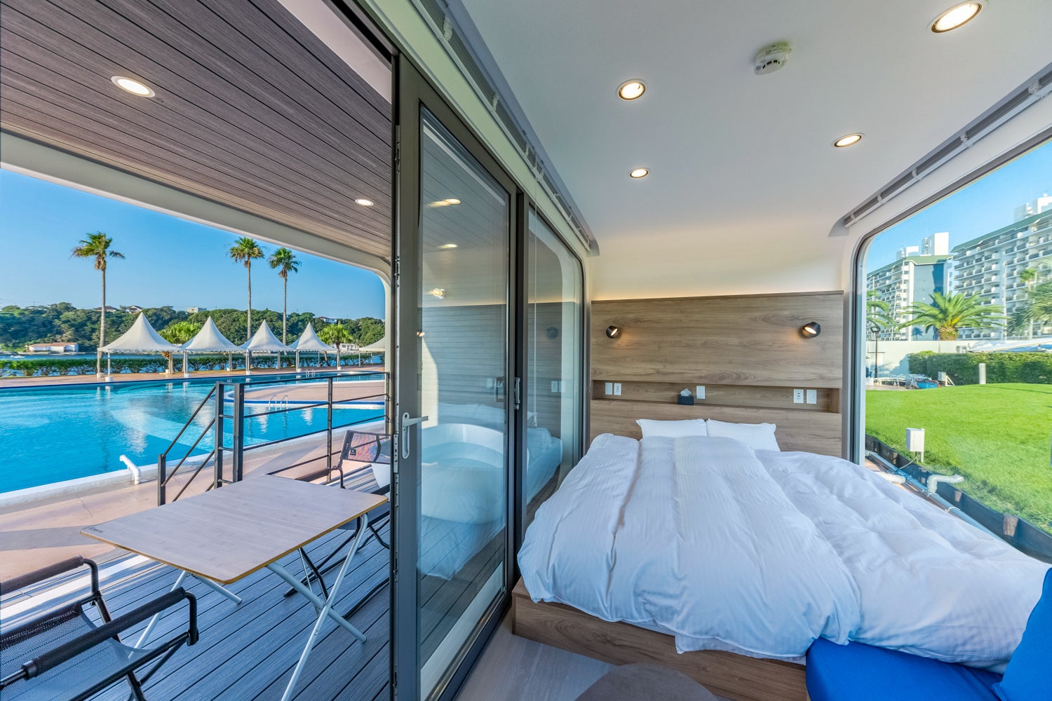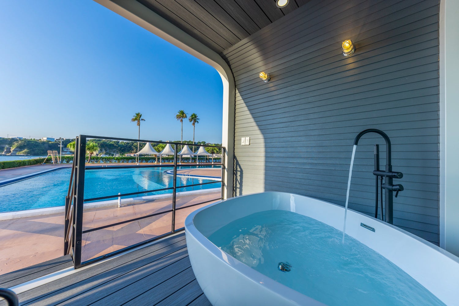 開放感ある一面のガラスに、そよぐ潮風を楽しむ広いテラスを有する客室は、オーシャンビューの好立地を存分に楽しんでいただく為の日本初の新たなデザイン。時に爽快で、時に幻想的な海の情景とともに過ごす憧れの海のリゾートステイをお約束いたします。1棟貸切のオーシャンビュー客室で上質な非日常のひとときをお過ごしください。