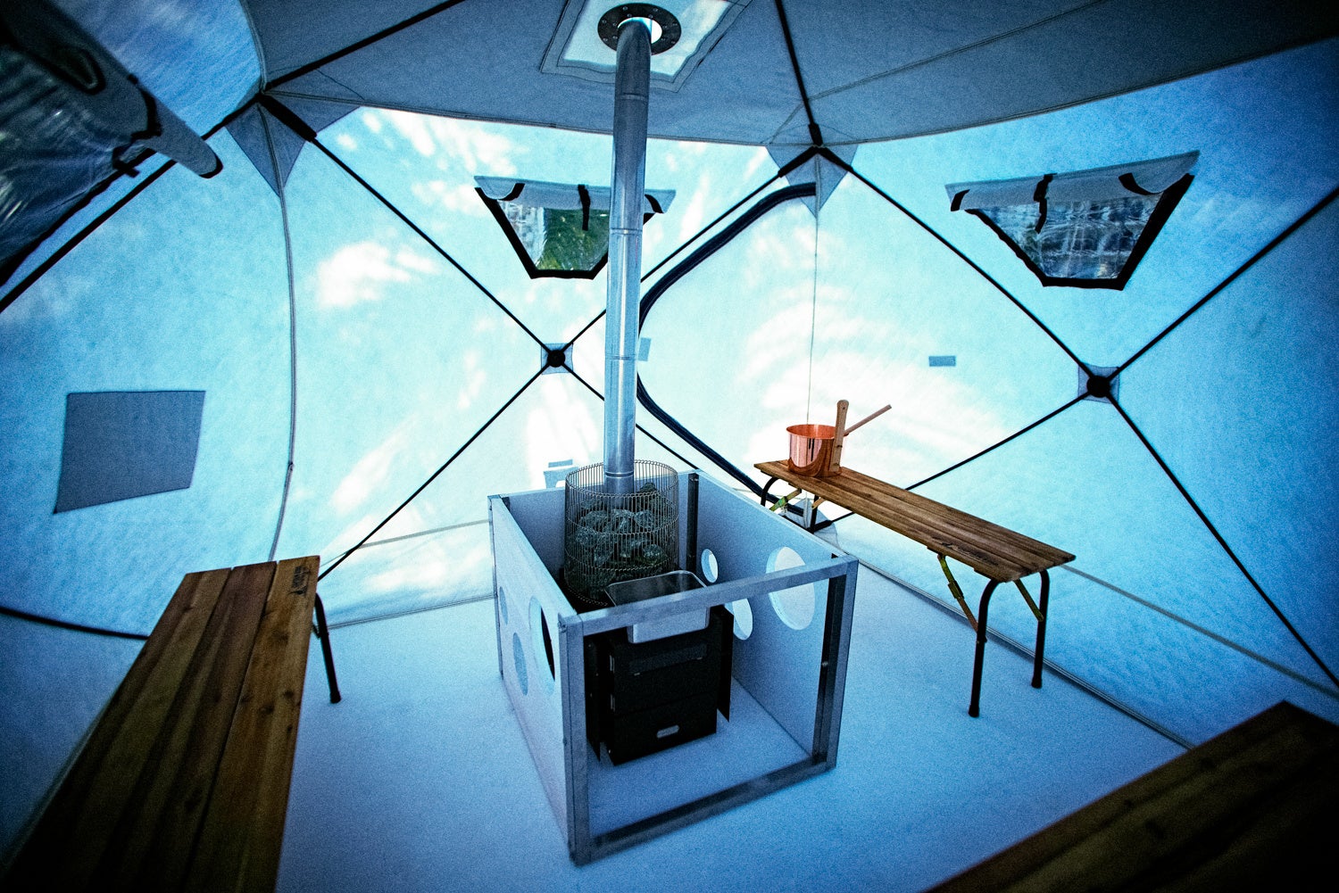 宿泊者のみご利用いただけるテントサウナ。本格フィンランドサウナを楽しむプライベートスペースを完備。ほぼ無煙のバイオマス燃料を使用したストーブ。古くからフィンランドのサウナで使用されているカンラン石のサウナストーンにセルフロウリュでお楽しみください。富士山を眺める絶景ととのいスペースでは、水風呂やインフィニティチェアを揃え、極上のととのい時間をお過ごしいただける空間を用意しております。