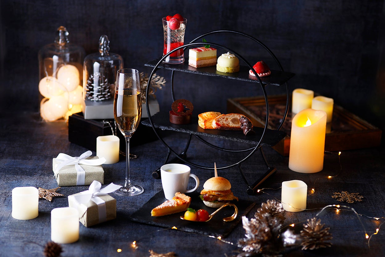 苺とホワイトチョコレートの滑らかなムースを2層にし、優しい甘さの中にバラの香りを忍ばせた「ロゼ・フレーズ」や、甘酸っぱいガナッシュにラズベリーのコンフィチュールを重ね、オーナメントのようなチョコレート細工を添えた「タルトショコラ・マンジャリ」、クリスマスの定番「シュトーレン」など 8 種のスイーツと、小さいながらもジューシーで本格的なローストチキンをピクルスや葉野菜とサンドした「ローストチキンミニバーガー」、チェダー、モッツアレラ、パルメザンなど数種のチーズと生クリームでリッチな味わいに仕上げた「チーズのキッシュ」など4種のセイボリーがクリスマスの特別な高揚感を演出します。また、お飲物は10種類以上ご用意し、中でも期間限定のホテルオリジナルティー「クリスマスアールグレイ」は、国産のみかんや、コーンフラワー、マリーゴールドなどをブレンドし、爽やかな柑橘の中に可憐なフラワーハーブが香ります。