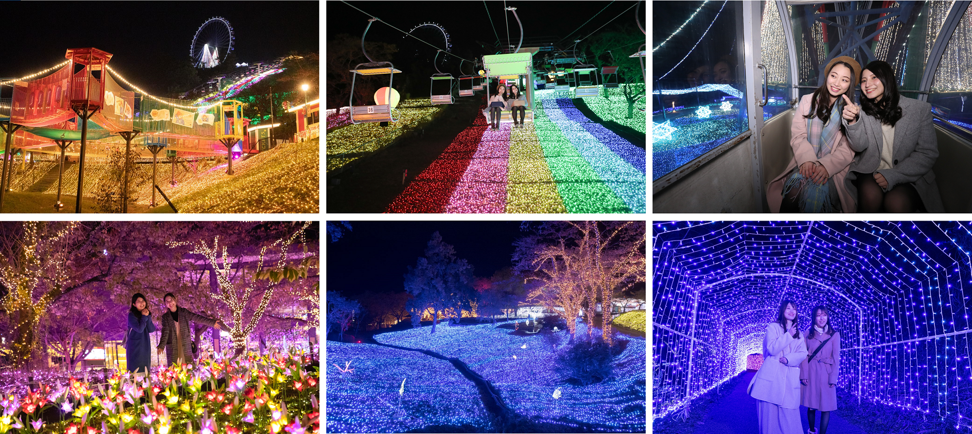広さ40,000㎡の広大な敷地に、関東最大級600万球の圧倒的なイルミネーションが幻想的に光り輝きます。20種類のアクティビティを楽しめる空中ネットアスレチック「ハッスルスパイダー」がカラフルにライトアップ、夜でも光に照らされた中で思いっきり身体を動かして遊べる「光の空中アスレチック」になります。そのほか、全長250mのリフトに乗ってイルミネーションの上空を空中散歩する「虹のリフト」や標高370mにそびえる「光のかんらんしゃ」など、起伏に富んだアウトドアリゾートならではの「空から眺めるイルミネーション」が充実しています。