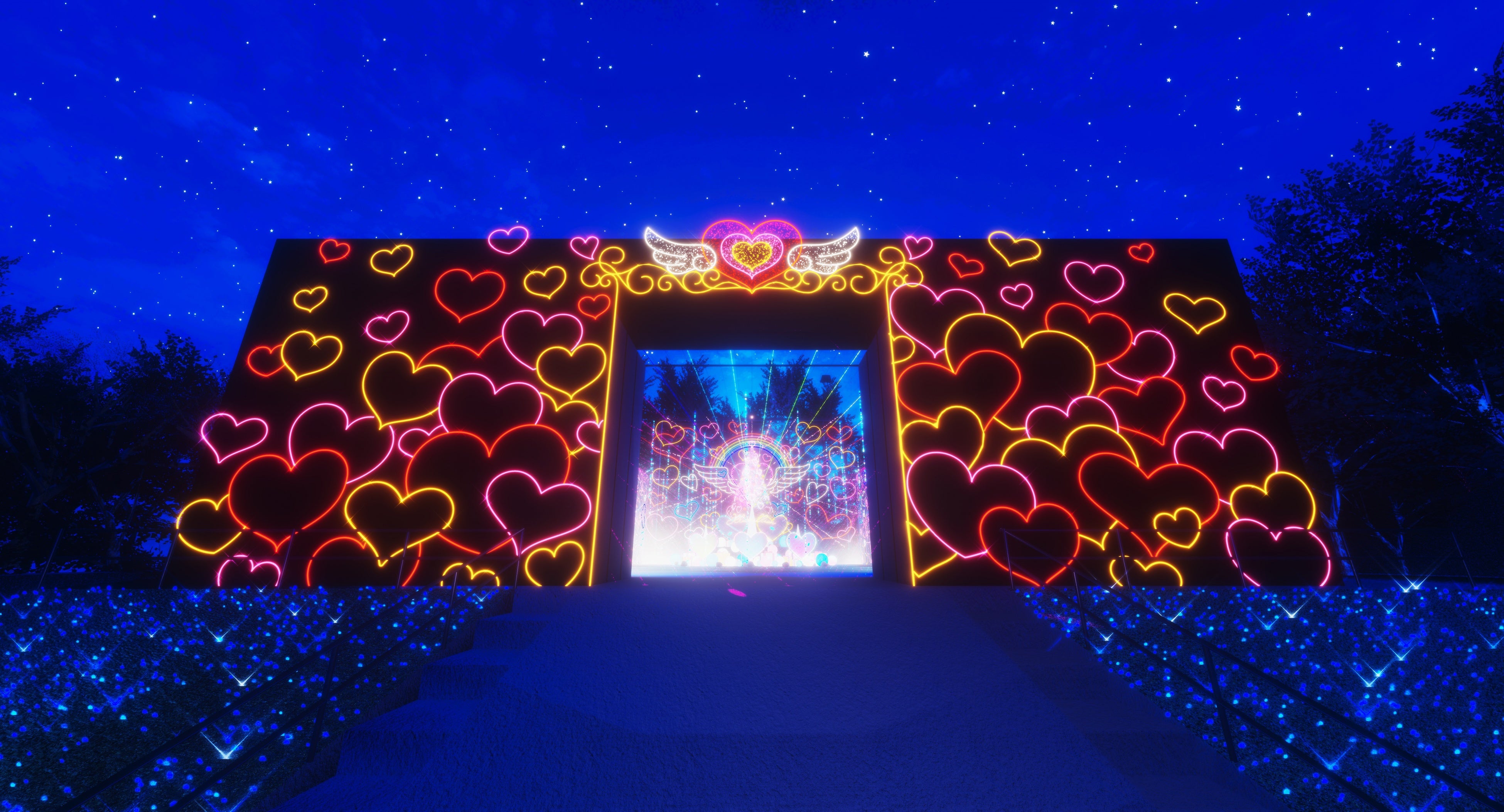 山の中腹にあるこのエリアは、静けさに包まれたエリア。門をくぐり足を踏み入れるとそこには360度1,000個ものハートがいっぱいにちりばめられた空間が広がります。クリスマスソングに合わせてハートのイルミネーションが色とりどりに輝くショーのあと、アップテンポな音楽に合わせてムービングライトやレーザービームも加わるなど雰囲気が一転、さらに色鮮やかに華やかなショーが繰り広げられます。
