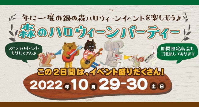 株式会社銀の森コーポレーション(本社:岐阜県中津川市/代表取締役社長:渡邉好作)が運営いたします、食と自然のテーマパーク「恵那銀の森」にて2022年10月29日30日の2日間“森のハロウィンパーティー”をテーマとしたハロウィンイベントを開催することとなりましたのでお知らせいたします。