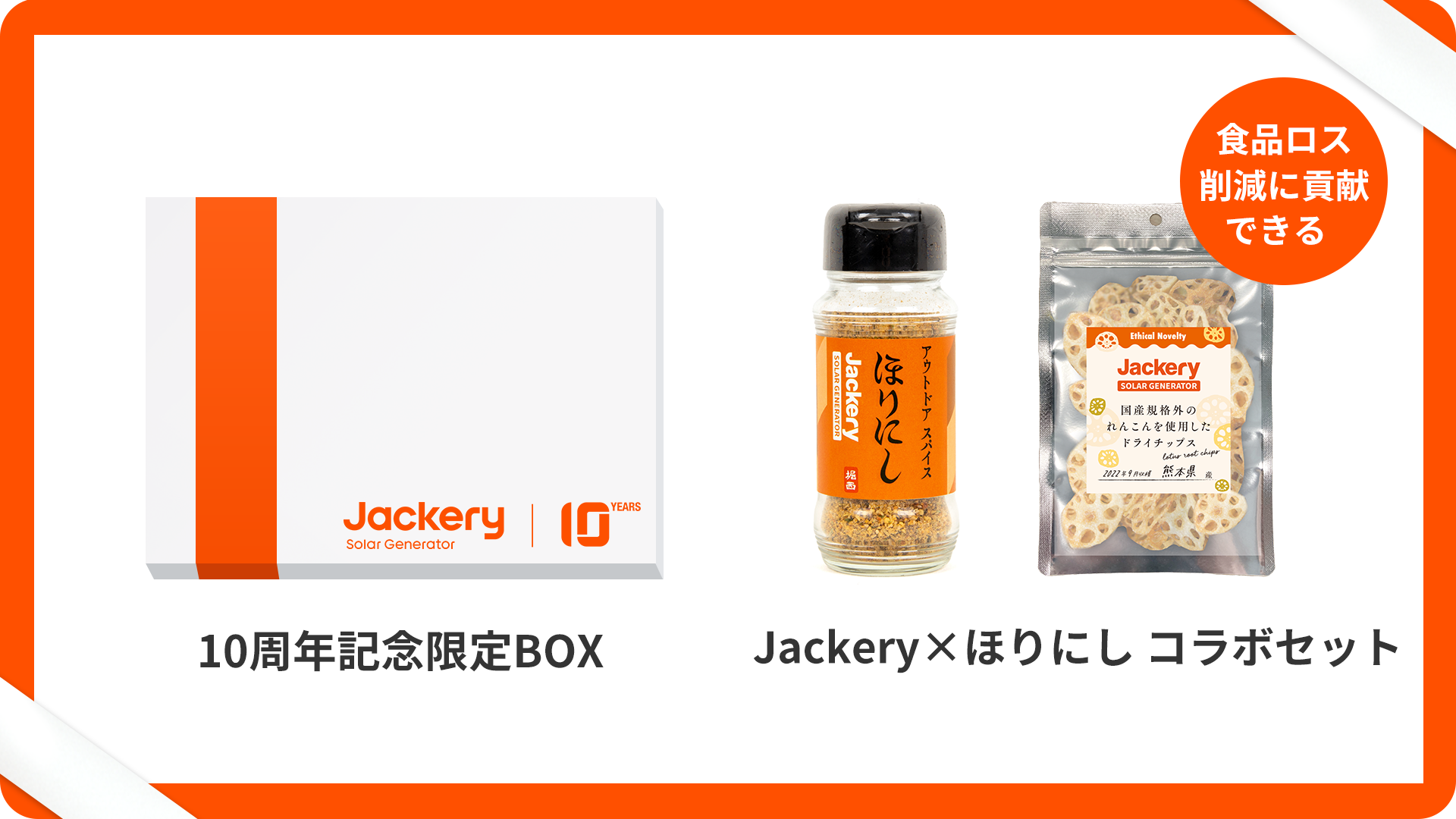 Jackery10周年記念限定BOXと食品ロス削減!規格外のレンコンを使った「レンコンチップス×ほりにしコラボセット」など、Jackeryオリジナル商品を合計50名様にプレゼントします。