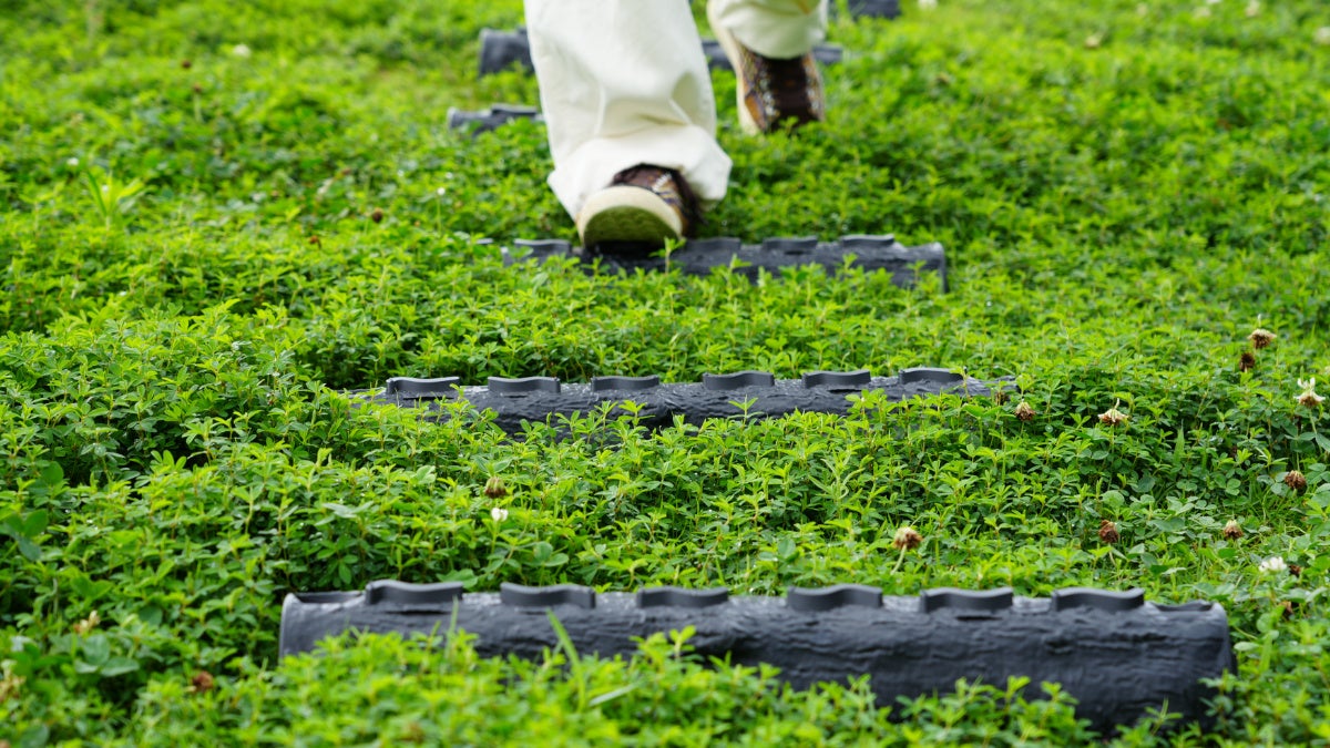 設置はカンタンで、木の根を傷めず、地面の改変を最小限にすること、素材は100%リサイクル材使用、放置竹林の問題に微力ながらアプローチするため竹プラスチックを2〜3%配合にて商品化しました。旧タイプ(レールート)にて発明奨励賞を受賞した、山道階段の老舗メーカーが開発。