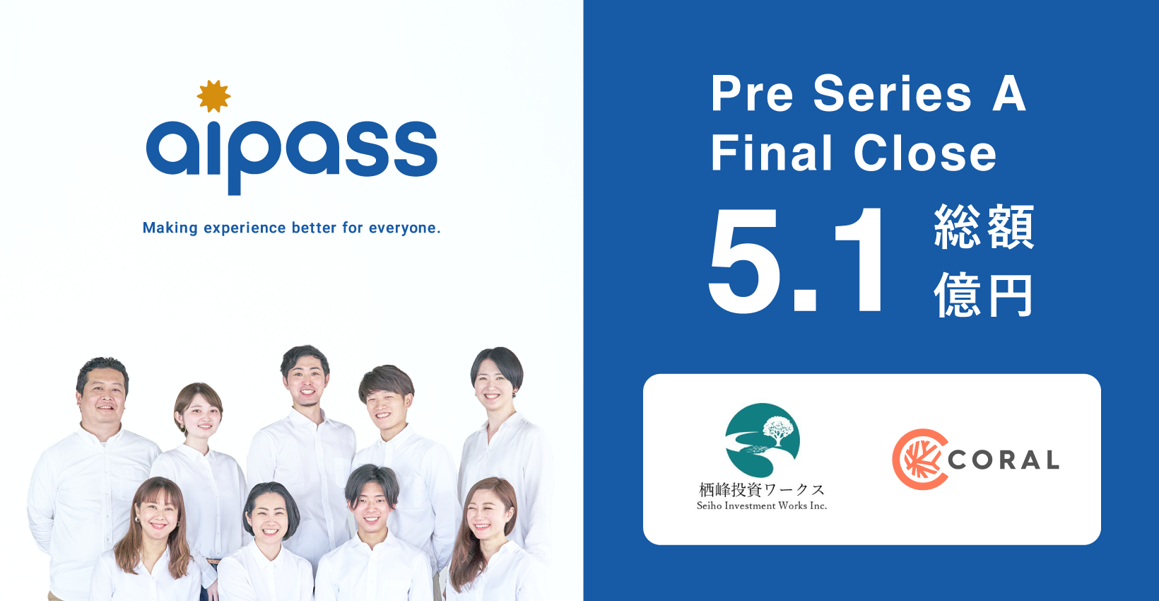 宿泊・旅行業を中心にExperience Systemを提供するaipass株式会社(本社:東京都渋谷区、代表取締役:辻 慎太郎、以下 アイパス)は、株式会社Coral Capital(本社:東京都千代田区、創業パートナー兼CEO:James Riney、以下 Coral Capital)及び栖峰投資ワークス株式会社(本社:京都市下京区、代表取締役 関 兵馬、以下 栖峰投資ワークス)より、プレシリーズAのファイナルラウンドとして総額2億円の資金調達を実施しました。今回の調達で本ラウンドの累計調達額は5.1億円となり、クローズいたしました。