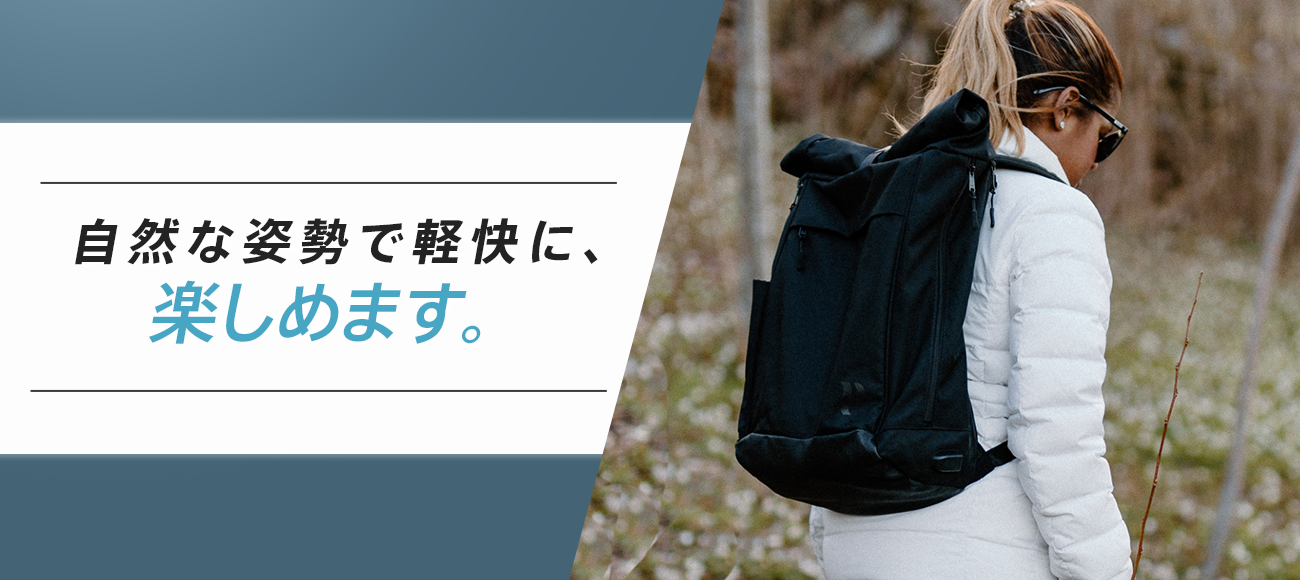 また、「姿勢垂直システム」により体を真っすぐに保つため、体幹で荷物を支え重さを体全体に分散します。