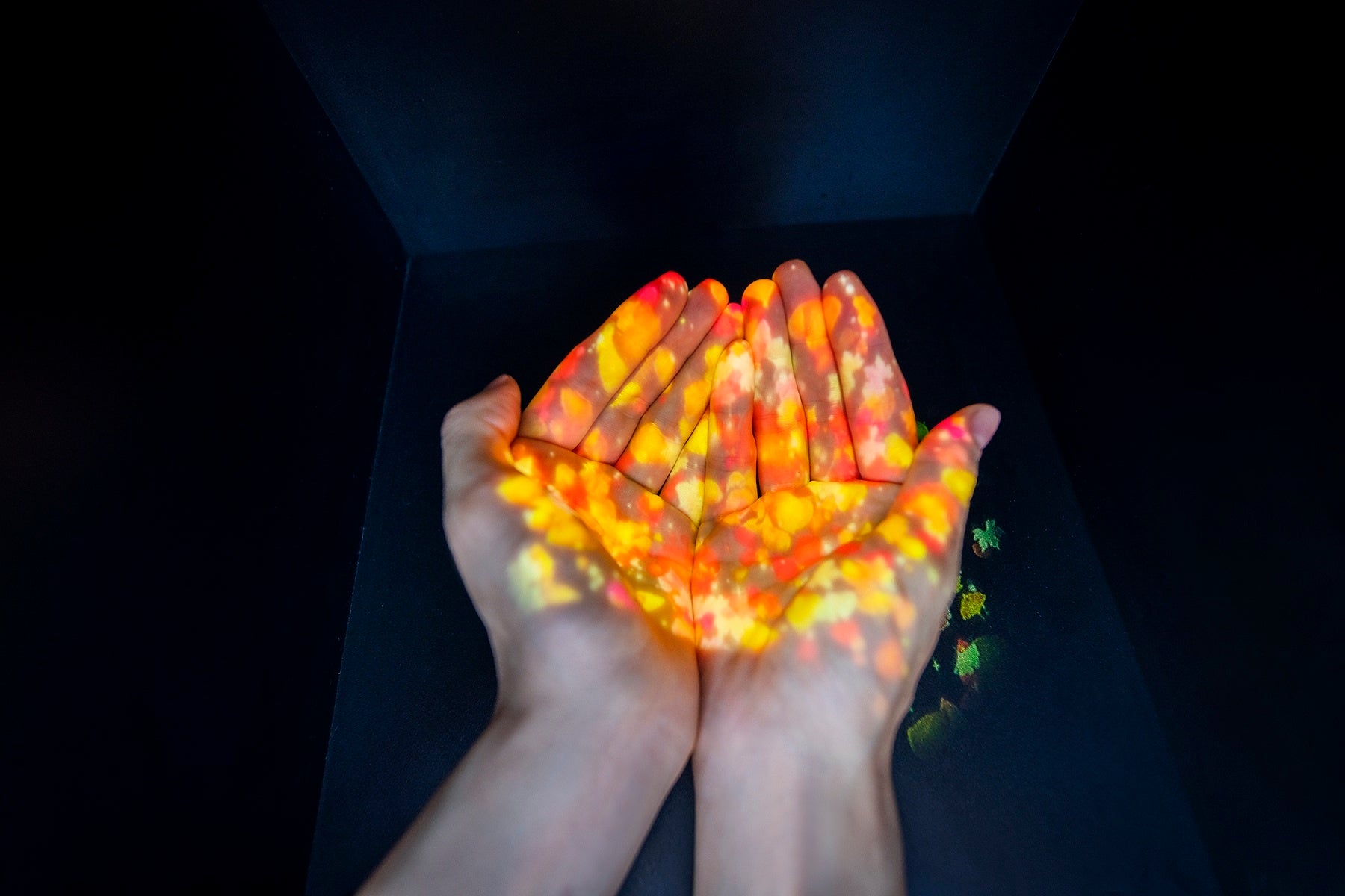 興聖寺に設置。茶室に入る前に手を清める「蹲(つくばい)」をイメージした感染症対策アート。手を差し込むとアルコール除菌液と共に、光の花が手のひらに映し出される。