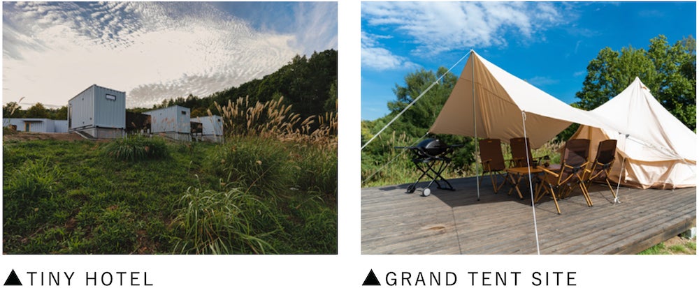 春は新緑の芽生えとともに、夏は緑豊かで涼しく、秋は収穫された美味しい食材の恵みと、冬は真っ 白な幻想的空間など、四季折々の楽しみが満載の北海道を背景に4つの滞在スタイルをご用意いた しました。アウトドアでありながらホテルの快適さとプライベートサウナを備えた「TINY HOTEL」、 Sʼmore社製グランピングテントにウッドデッキを配置した「GRAND TENT SITE」、林間エリアに は骨太な山小屋をイメージした木製の「CABIN」と、ご自身のお気に入りキャンプギアをお持ち込み いただき楽しめる「FOREST TENT SITE」の4つの施設で、ご利用スタイルに合わせたプランで皆 さまをお迎えいたします。 宿泊に限らずデイユースでのアウトドアも満喫いただけるよう、自然の中で味わうテントサウナや、 薪割りからファイヤーピットでの焚き火、フィンランド発祥のゲーム「モルック」などのアクティビティ 体験もご用意しております。デイキャンプやご宿泊時の食事は、各季節ごとに地元食材を中心に使 用したバーベキュー。自分で作るキャンプの醍醐味はそのままに、ウエーバー社製の本格グリルで快 適に食事をお楽しみいただけます。また、お泊まりでの朝食では、地元食材を使用したホットサンド ウィッチとハンドミルでのオリジナルブレンドコーヒーをお召し上がりいただけます。