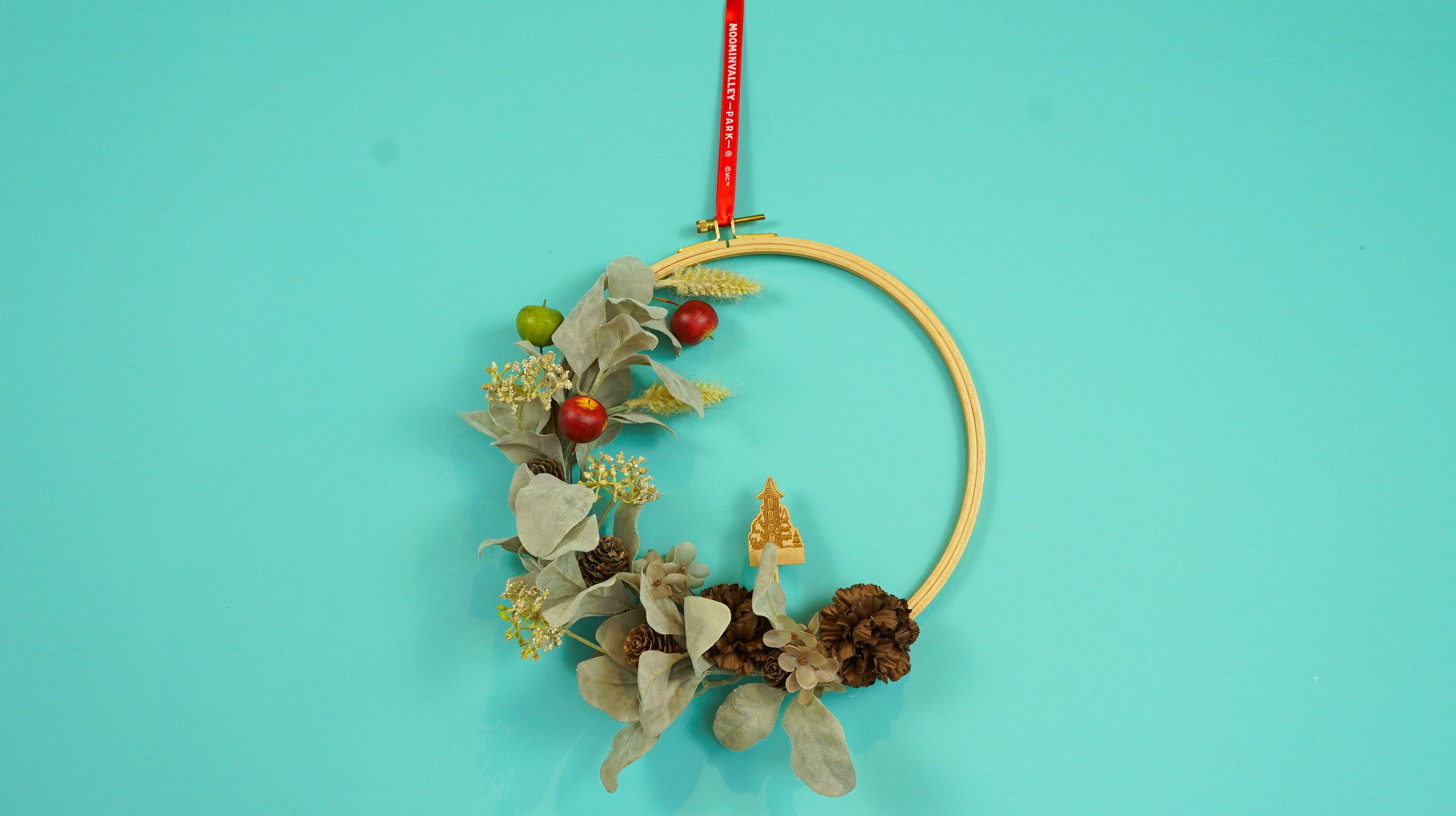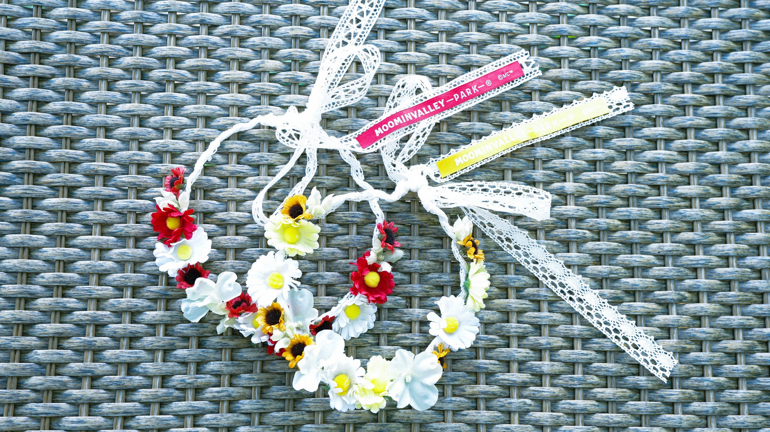 フレームに造花を接着し、リースを作ります。ムーミン屋敷のピックで飾り付けます。