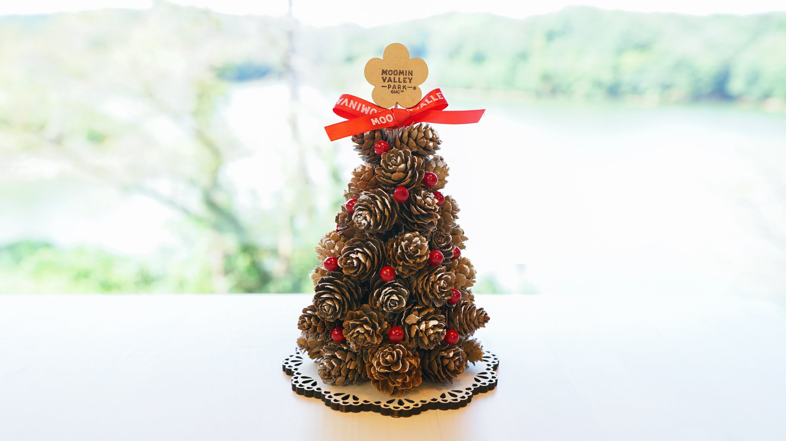 松ぼっくりを積み重ね、季節のツリーを作ります。リボンや木のピックで飾り付けてみましょう。