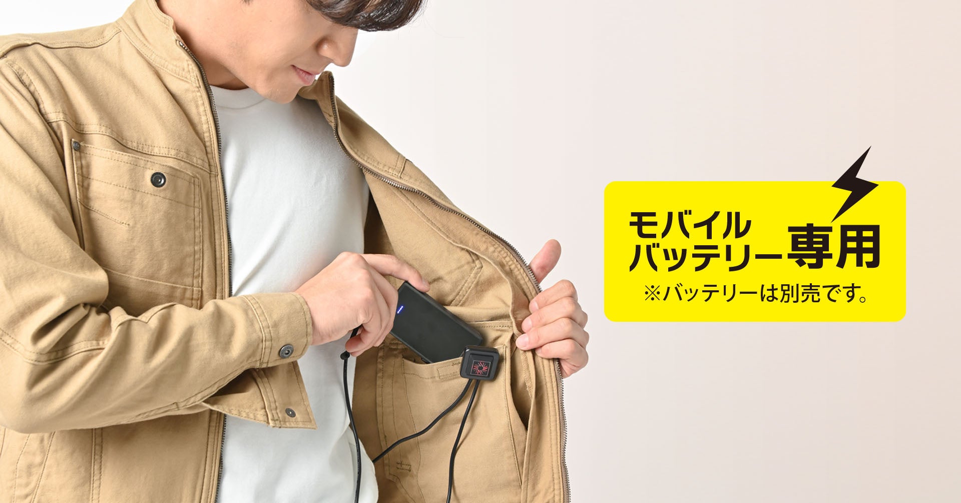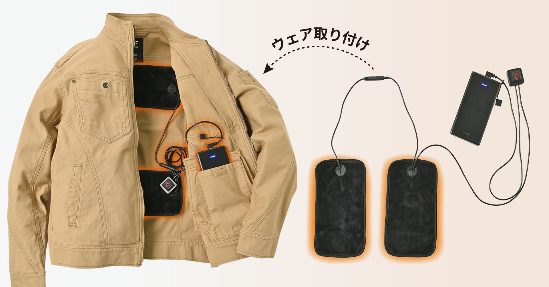 スマートフォンなどを充電するモバイルバッテリー(別売)で稼働。高価な専用バッテリーを購入する必要はなく、携帯用バッテリーが使用できるため、外出先でも気軽に着用可能です。使い捨てカイロもいいですが、モバイルバッテリーと接続することで繰り返し何度でも使用できる、使い捨てではない、地球にやさしいサステナブルヒーターです。