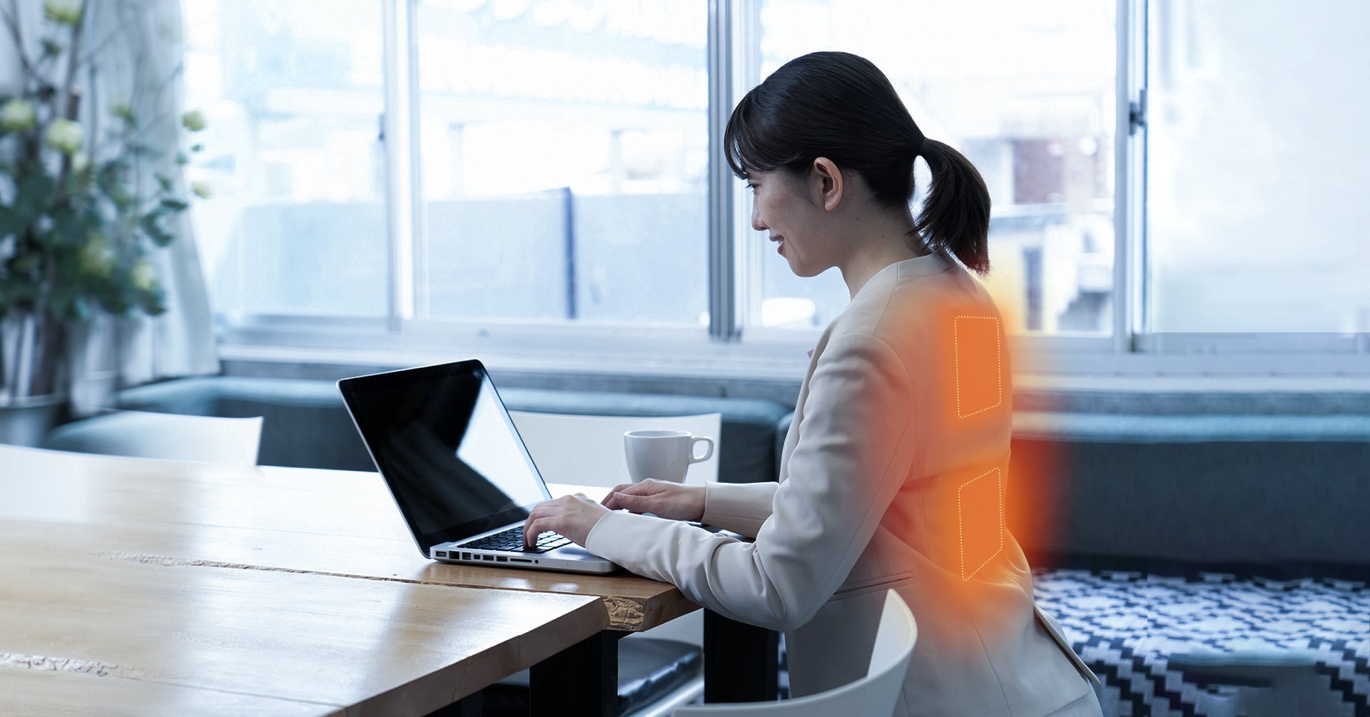 専用の面ファスナーを貼るだけで、簡単に着脱可能。気温や温度の感じ方によって、お腹や腰、背中などご自身の温めたい位置に簡単に調節可能、着用することで、じんわりと温かくなります。