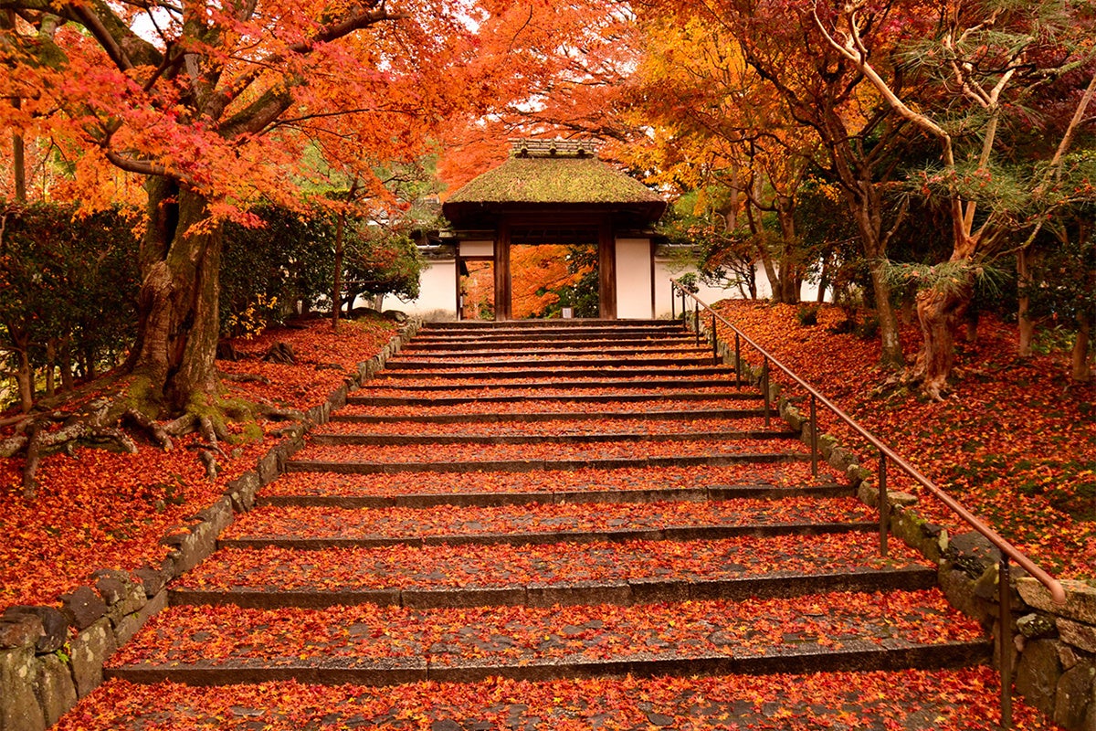 1378(永和4)年に創建された、日蓮宗の由緒寺院のひとつ「妙覺寺」。通常は年2回のみ開催される特別拝観でしか一般に公開されていません。本堂前に広がる「法姿園」では、散り紅葉が苔の庭を埋め尽くす、シンプルながらもまるで絵画のような見事な景色を見ることができます。