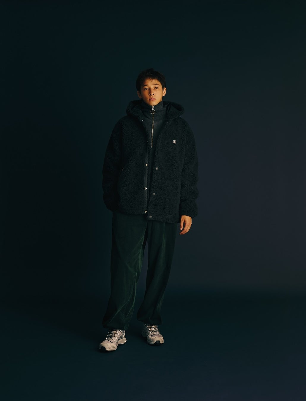 毛足がやや短く、軽やかなタッチ感に仕上げました。フロントはダブルファスナーで、複数の着こなしが楽しめます。襟付きタイプで、フロントファスナーを上げてスタンドネックにすると首まわりも暖かい仕様になっています。両サイドは、手を入れると暖かいハンドウォーマーポケットで、上部の舟型デザインがさりげないアクセントに。胸ポケットもヨットの帆の形をイメージしています。袖や裾はすっきりとしたバインダー仕様で、ミドラーとして重ね着しやすくしています。ペットボトルが原料のリサイクル糸を使用した環境配慮型素材を使用しています。