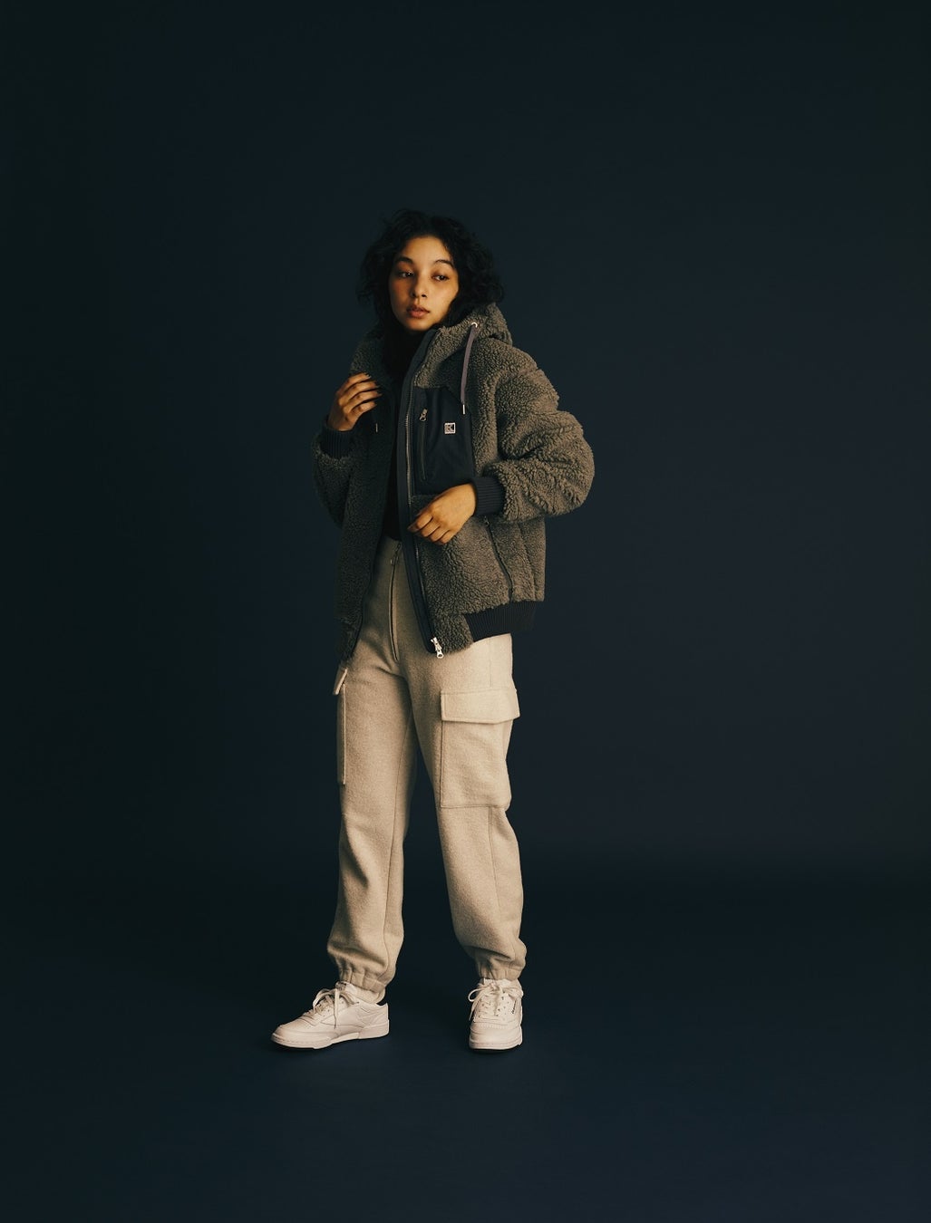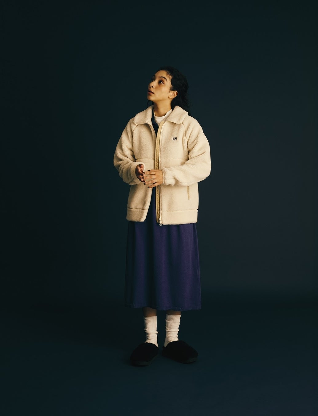 毛足がやや短く、軽やかなタッチ感に仕上げました。フロントはダブルファスナーで、複数の着こなしが楽しめます。襟付きタイプで、フロントファスナーを上げてスタンドネックにすると首まわりも暖かい仕様になっています。両サイドは、手を入れると暖かいハンドウォーマーポケットで、ポケット上部の舟型デザインがさりげないアクセントに。袖や裾はすっきりとしたバインダー仕様で、ミドラーとして重ね着しやすくしています。