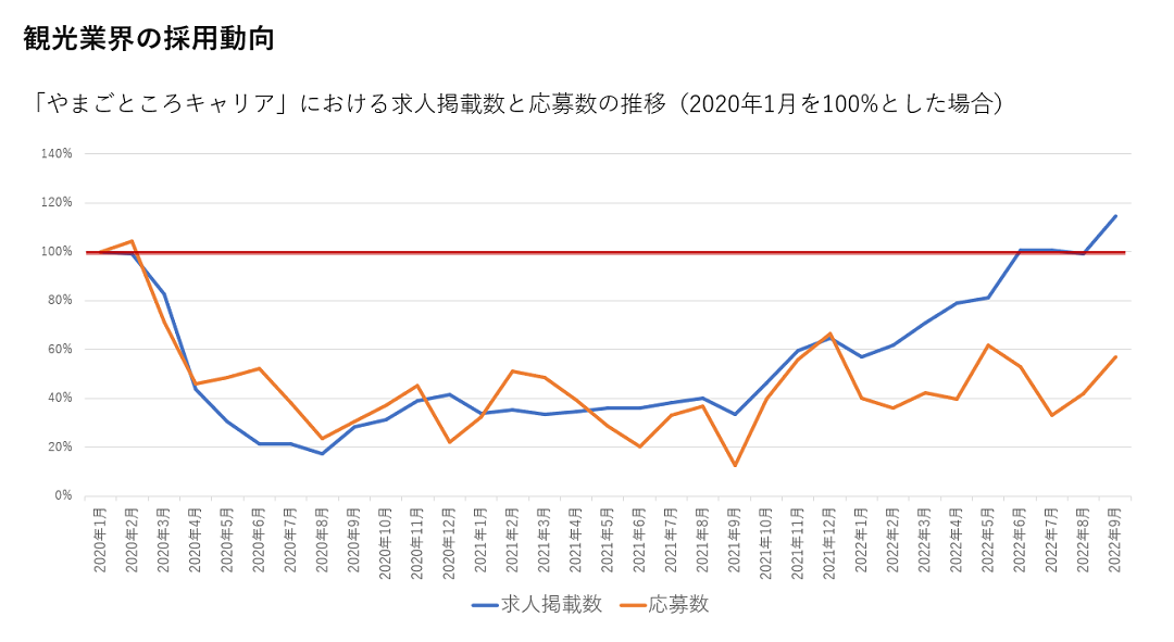 インバウンド専門の求人サイト「やまとごころキャリア」の求人掲載件数は、新型コロナウイルス感染拡大の影響で、一時は2020年1月比で20%を切るまでに落ち込んだ。しかしながら今春以降は急激な回復を見せ、2022年9月にはコロナ前の水準を上回った。一方で、応募数は依然としてコロナ前の50%程度に留まっている。今回、当社が定期的に実施している当サイトの登録会員向けの「観光業界で働くことへの意識調査」の結果を報告するとともに考察をする。尚、本調査は岸田総理大臣が全国旅行支援の開催表明をする前に実施したものであることに留意頂きたい。