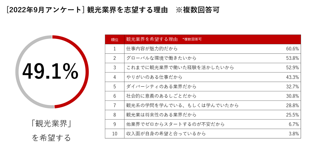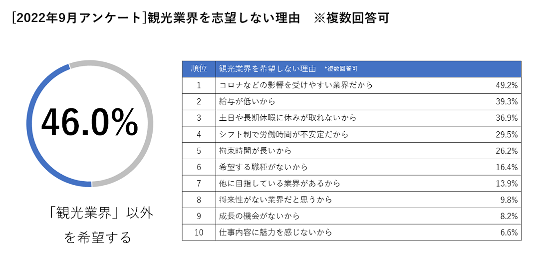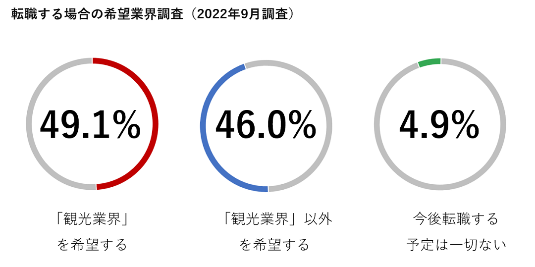 ・求職者のうち観光業を希望しない割合は依然として半数近くいることに加え、観光業を希望している求職者も同職種で2倍以上の給与水準である海外へ流出する可能性があることから国内観光業界の人手不足がより一層深刻化する。