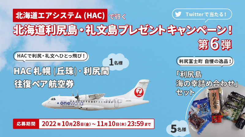 クリプトン・フューチャー・メディア株式会社(本社:北海道札幌市、代表取締役:伊藤博之、以下クリプトン)では、北海道エアシステム株式会社(以下HAC)・利尻富士町・利尻町・礼文町と連携し、2022年6月~10月にかけて「HACで行く北海道利尻島・礼文島プレゼントキャンペーン」を実施しております。期間中は毎月、HAC札幌(丘珠)・利尻間の往復ペア航空券やご当地品が当たるキャンペーンを『Domingo』公式Twitter(https://twitter.com/cfm_domingo)にて開催。最後となる第6弾は10月28日(金)スタートですので、ぜひご参加ください。