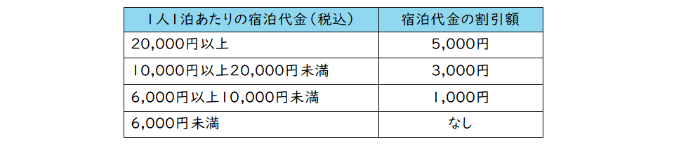 上記から計算される1人1泊あたりの単価に該当する割引額が適用されます。