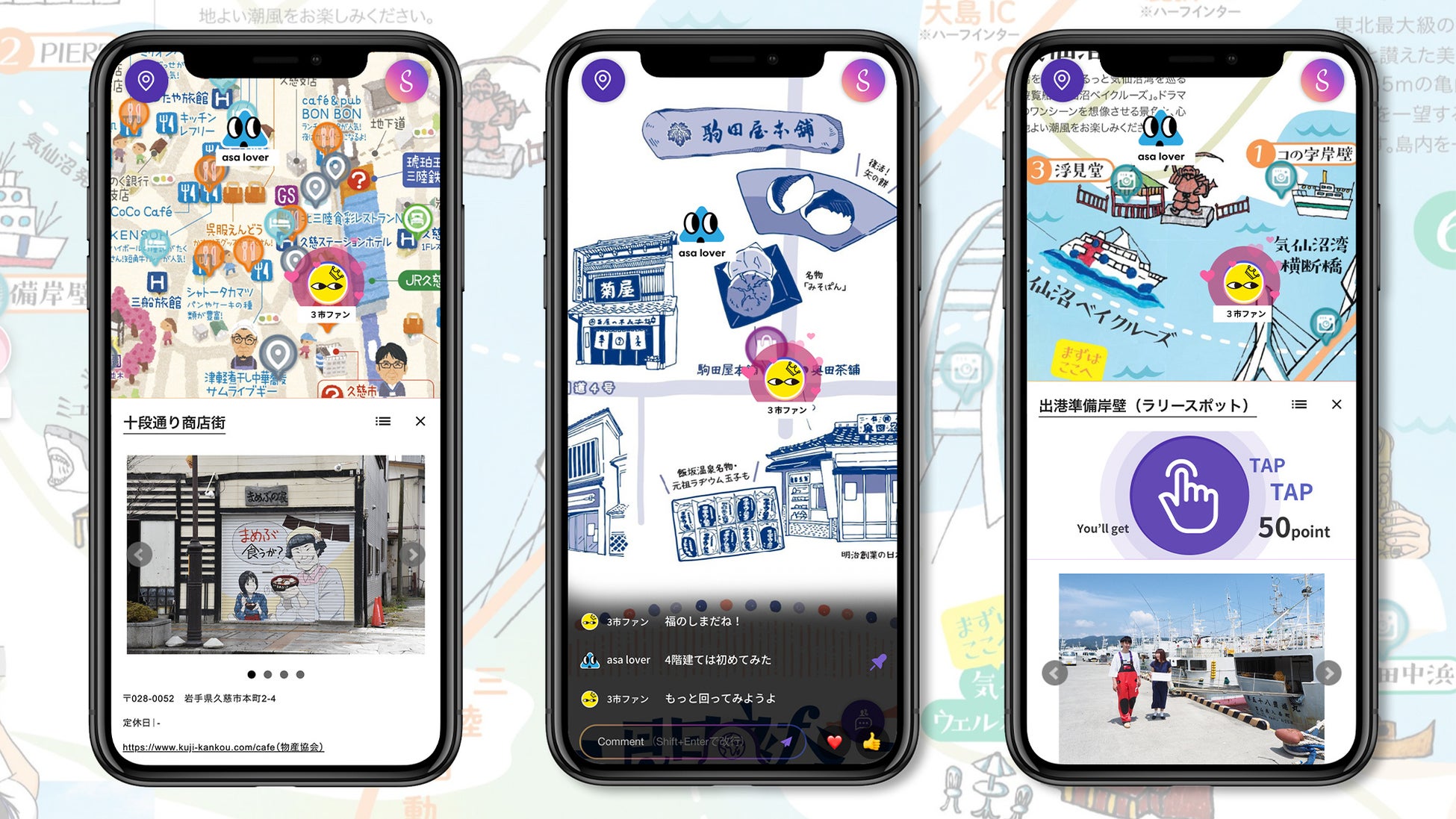 イラストマップを公開する、気仙沼市は2021年の朝ドラ「おかえりモネ」、久慈市は2013年の「あまちゃん」、福島市は2020年の「エール」に登場した舞台としてそれぞれ知られています。デジタルマップでは、ドラマのロケ地やゆかりの地、地元の特産品を使った飲食店などを掲載しており、観光客がスマートフォン上で観光スポットを探しながら周遊することができます。