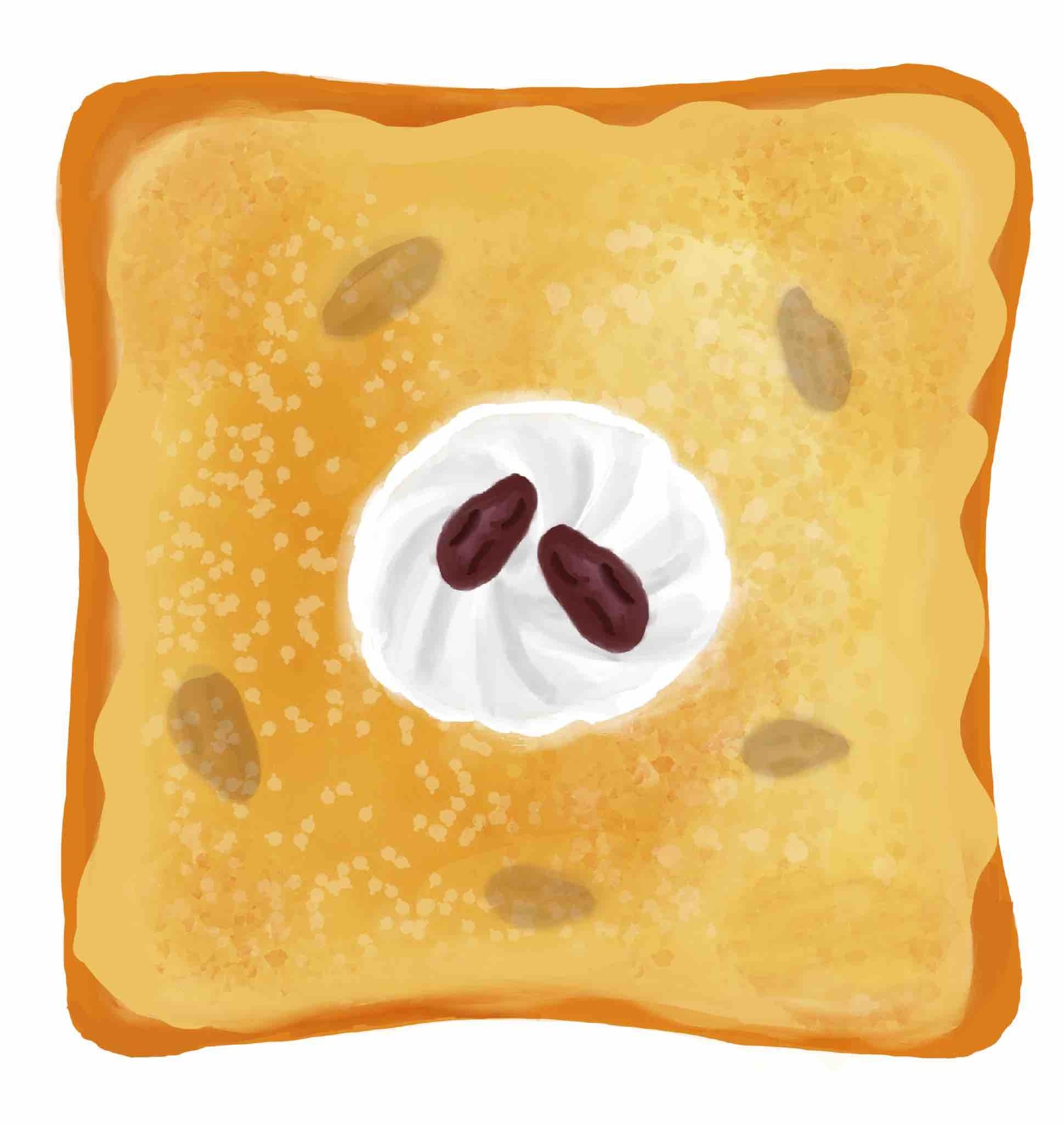 ②食パンに塗り、スライスチーズをのせ、トースターで焼く。 ③レーズン(2-3粒)をパンにのせ、トーストの中心にホイップをのせて完成。
