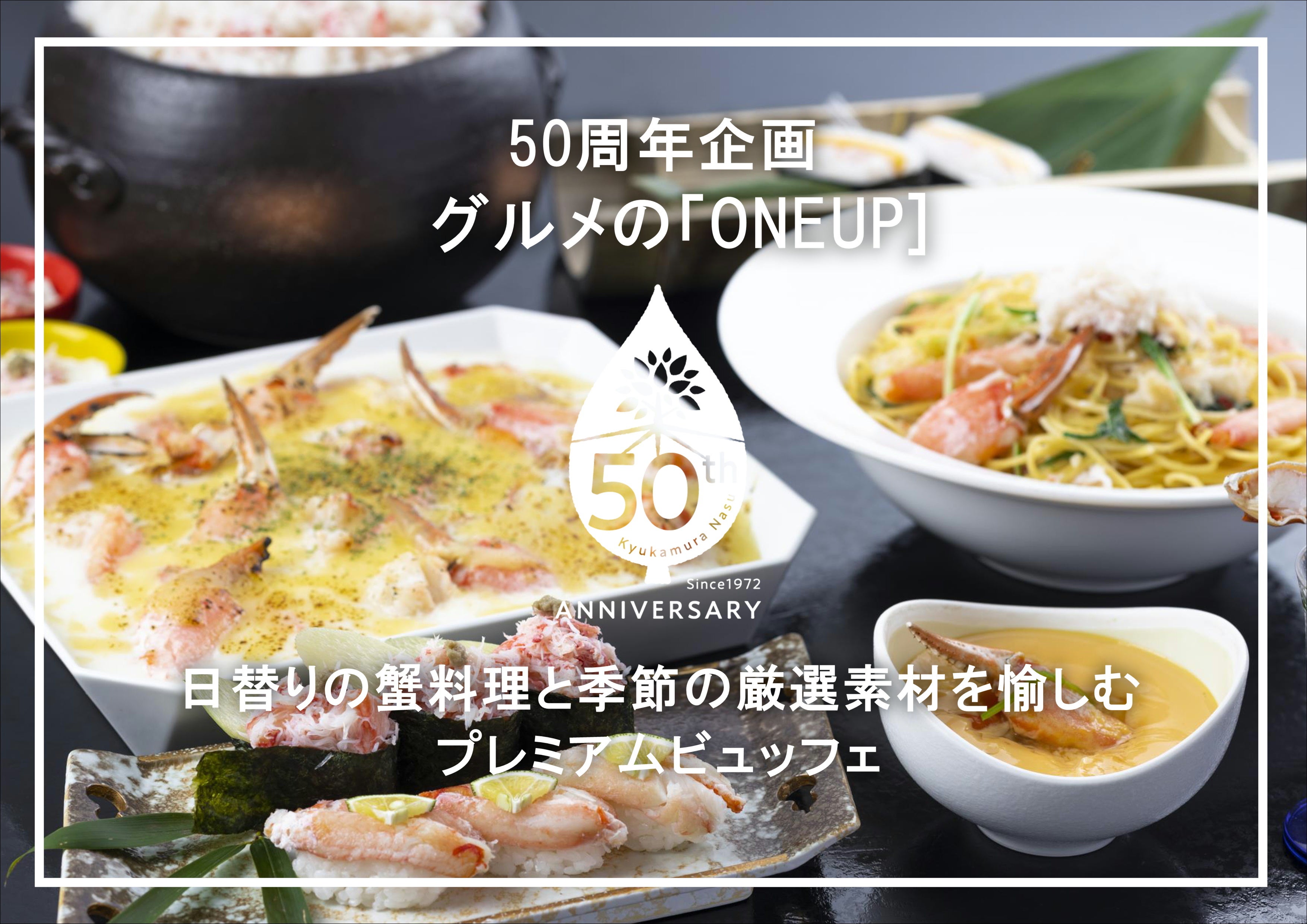 グルメ企画や、星のソムリエがご案内する星空カフェや地元演奏家の方々によるミニコンサートなどの体験、ウェルカムサービス、新しいお土産など、50周年の感謝を込めて、これまでの休暇村那須が取り組んでいるサービスにちょっぴり嬉しい「ONEUP(ワンアップ)」した内容でご用意いたします。