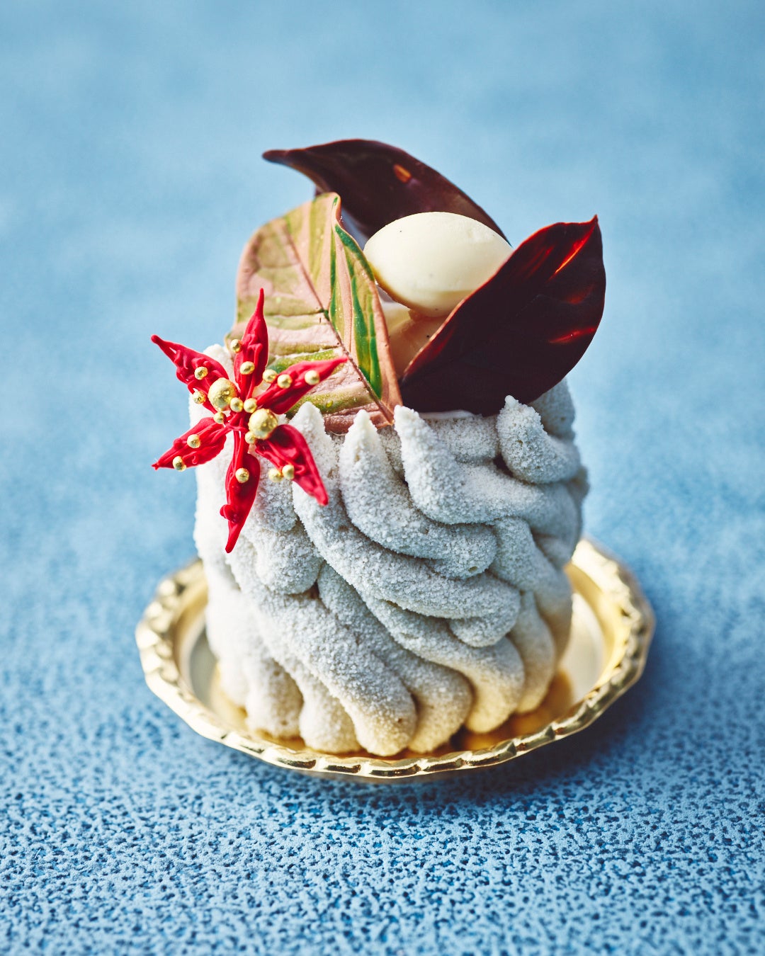 クリスマスオーナメントのような“スフェール(球体)”の形をした、グリーンの見た目がキュートなムース。外側の抹茶ムースにはホワイトチョコレートをあわせ、内側にはコク深いココナッツムースに洋梨のコンポートやベリーのジュレなどを忍ばせました。様々なフレーバーを楽しみながら、秀逸なペアリングをご堪能ください。