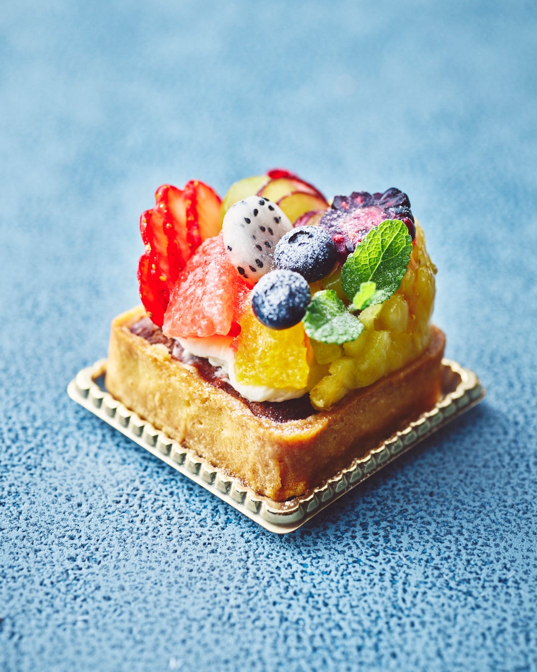 カラフルな旬の果物が華やかな、「果物市場(マルシェ・オ・フリュイ)」をイメージしたタルト。ガナッシュとフリュイルージュ(赤い果実)を入れしっとりと焼いたタルトには、カスタードを混ぜたマスカルポーネクリームを乗せ、果物をたっぷりとあしらいました。フルーツの自然な甘さに絶妙に寄り添う、カカオと赤い果実のタルトです。