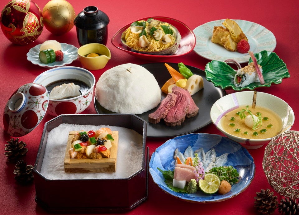 その他にも、「中国料理 龍鳳」(2階)では、広東料理とフレンチを融合させたオリジナリティ溢れるクリスマスだけの特別なディナーをご用意するほか、「皿倉」(1階)では、旬の味わいはそのままに、クリスマスカラーで彩った先附や雪に見立てた塩釜で焼き上げた肉料理など、遊び心溢れるホリデーシーズン限定のお品書きを揃えます。