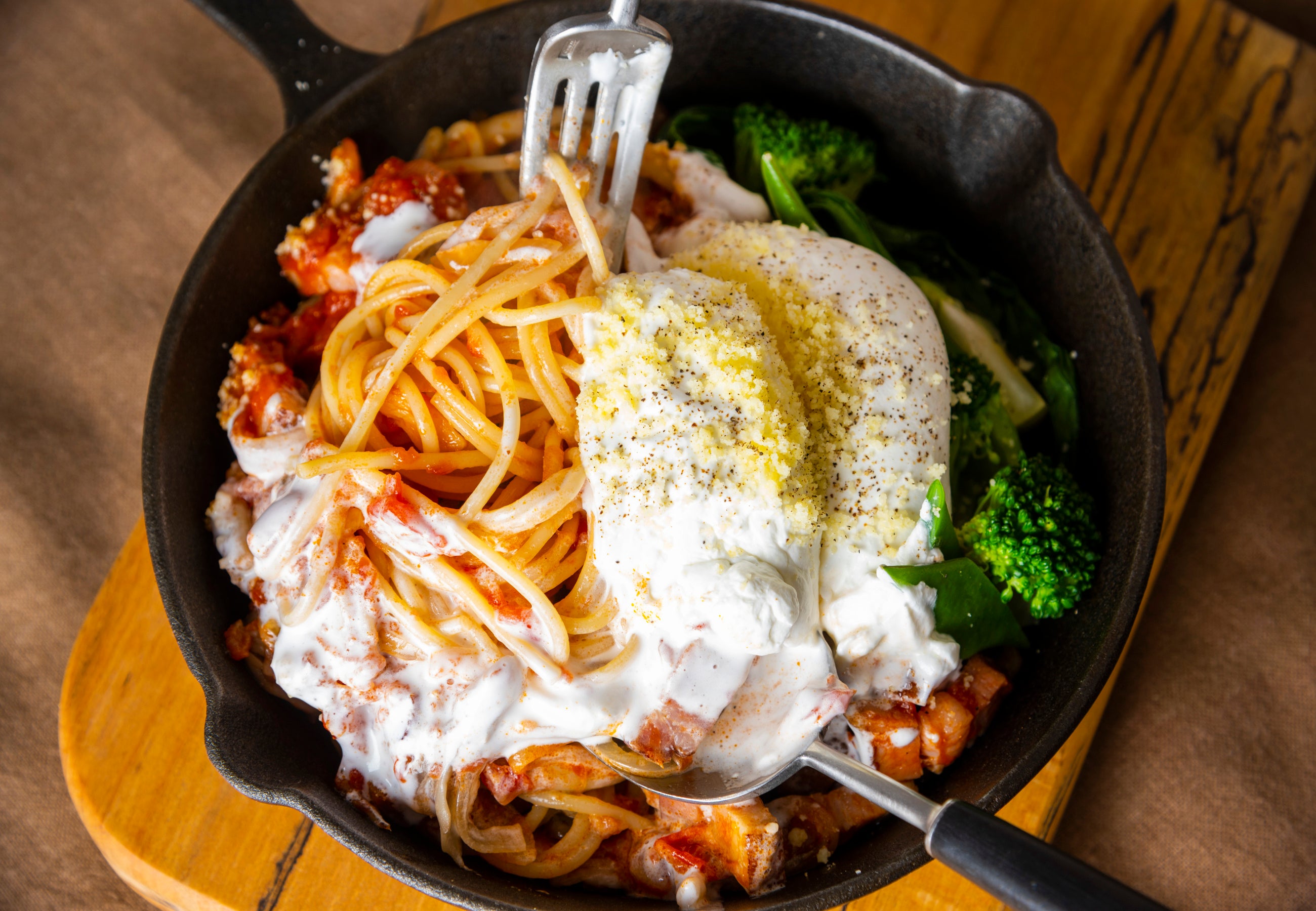 白馬の雪山のようにたっぷりのったチーズクリームを濃厚なトマトソースに絡めて味わう絶品パスタ。具材には、とろけるような脂の旨味に程よく塩味が効いた安曇野産のベーコンや、信州産のキノコや野菜をふんだんに使って、ボリューム感もある一品に仕上げました。スキーやスノーボードなどのレジャー後にもおすすめです。