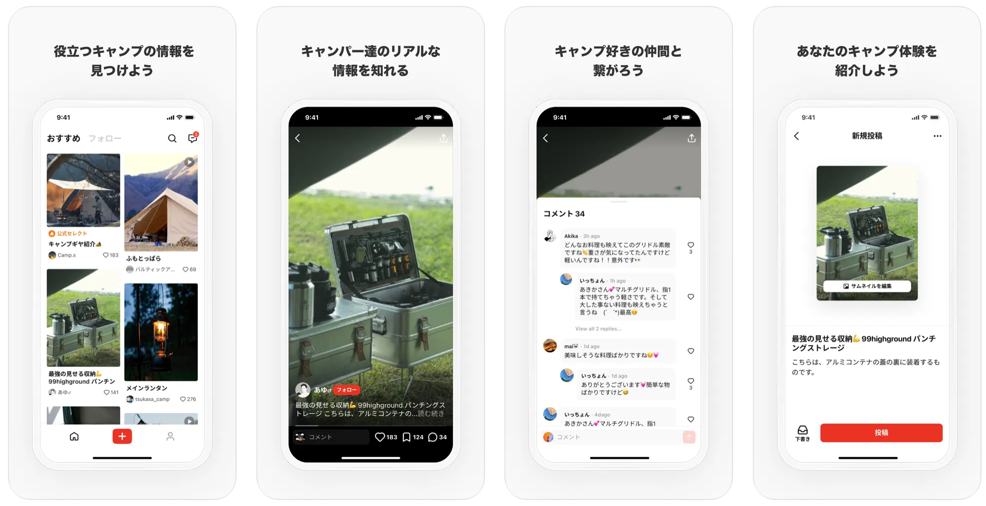 大切な人とのキャンプでの過ごし方や、自身が作り上げたキャンプスタイルをシェアすることで、キャンプの魅力をユーザー同士で分かち合いましょう。