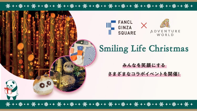 アドベンチャーワールド(和歌山県白浜町)は、株式会社ファンケルの旗艦店である「ファンケル 銀座スクエア」(東京都中央区)と、クリスマス期間限定でSDGsをテーマとしたコラボレーションイベントを開催します。イベントのテーマを「Smiling Life Christmas FANCL×ADVENTURE WORLD」とし、「ファンケル 銀座スクエア」にてパンダが食べ残した竹幹を使用した「竹あかり」の装飾展示や、ブランドコラボグッズやオリジナルグッズの販売を行うPOP-UP STOREなど様々なイベントを実施します。