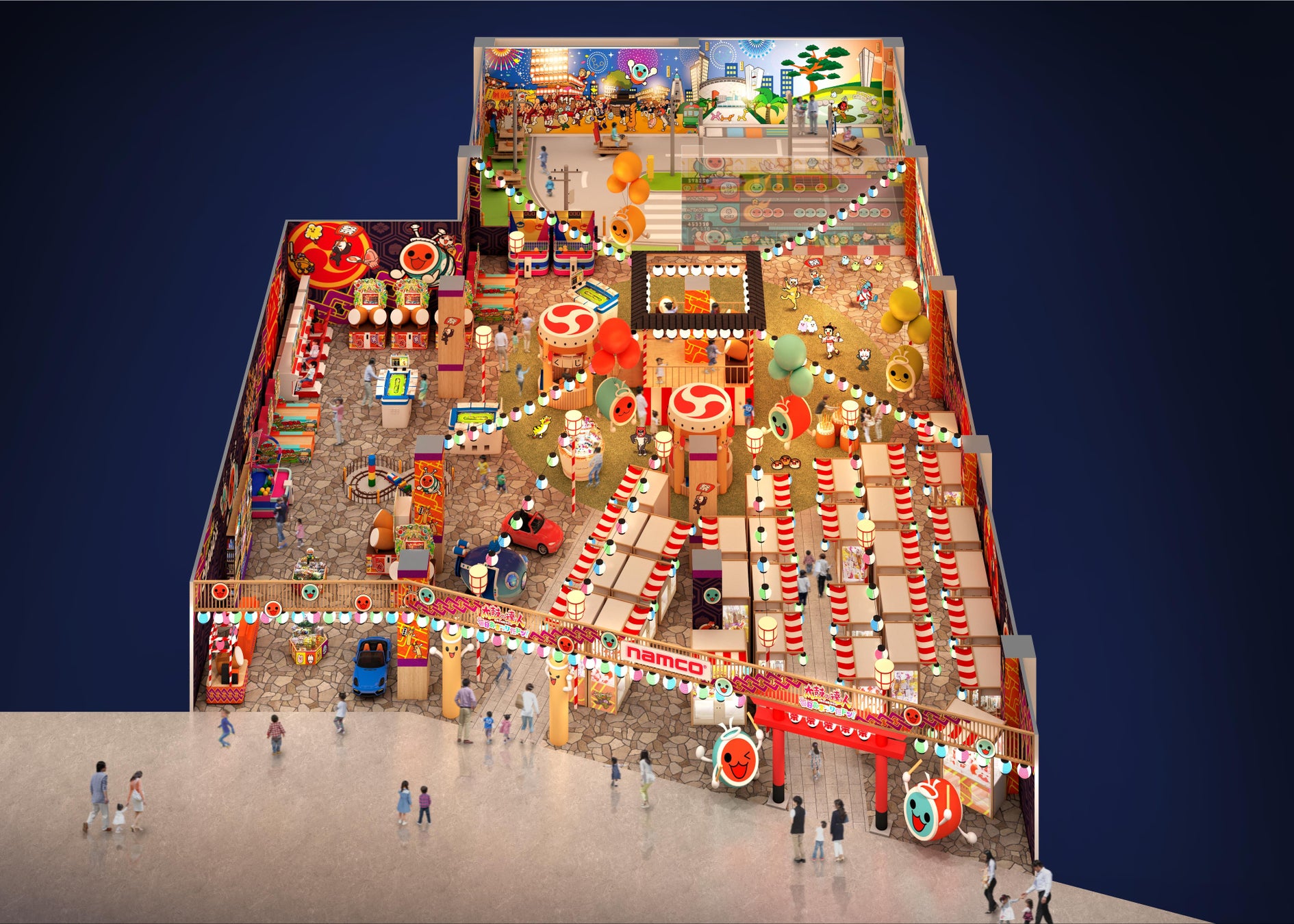 『namco太鼓の達人毎日おまつりだドン!ららぽーと堺店』は国民的音楽ゲーム『太鼓の達人』の世界観を用いて、堺の街や地域のお祭りを表現した日本初展開の新しいアミューズメントエリアです。