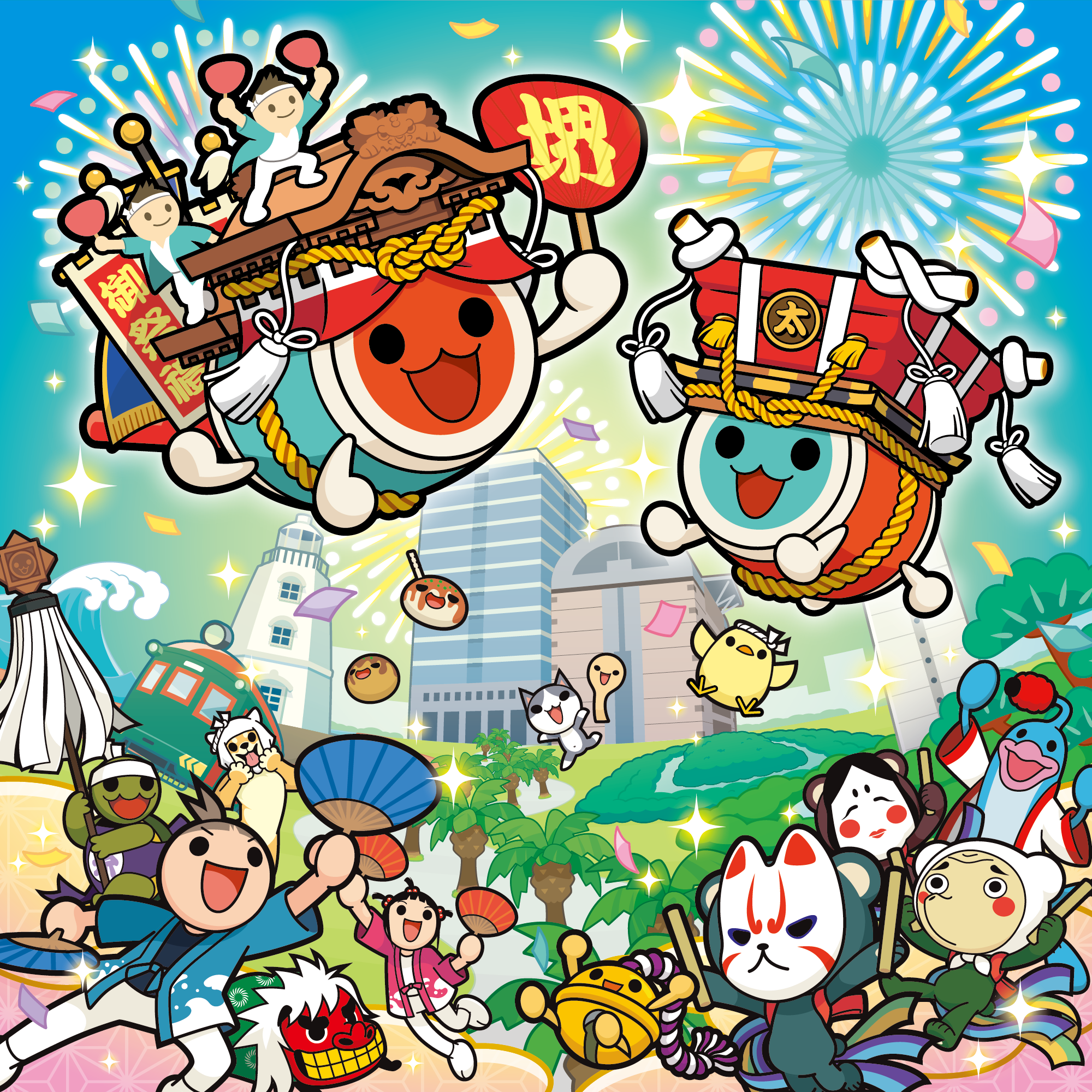 さらに「美原地車連合会」「堺まつりふとん太鼓連合保存会」「堺市美原区役所」の協力のもと、周辺地域のお祭りをモチーフにした『太鼓の達人』のメインキャラクター「どんちゃん」「かっちゃん」のイラストを新たに制作しました。また、オープンを記念して大阪で親しまれている「河内音頭」を全国の『太鼓の達人(ゲームセンター版)』に新たに配信する予定です。