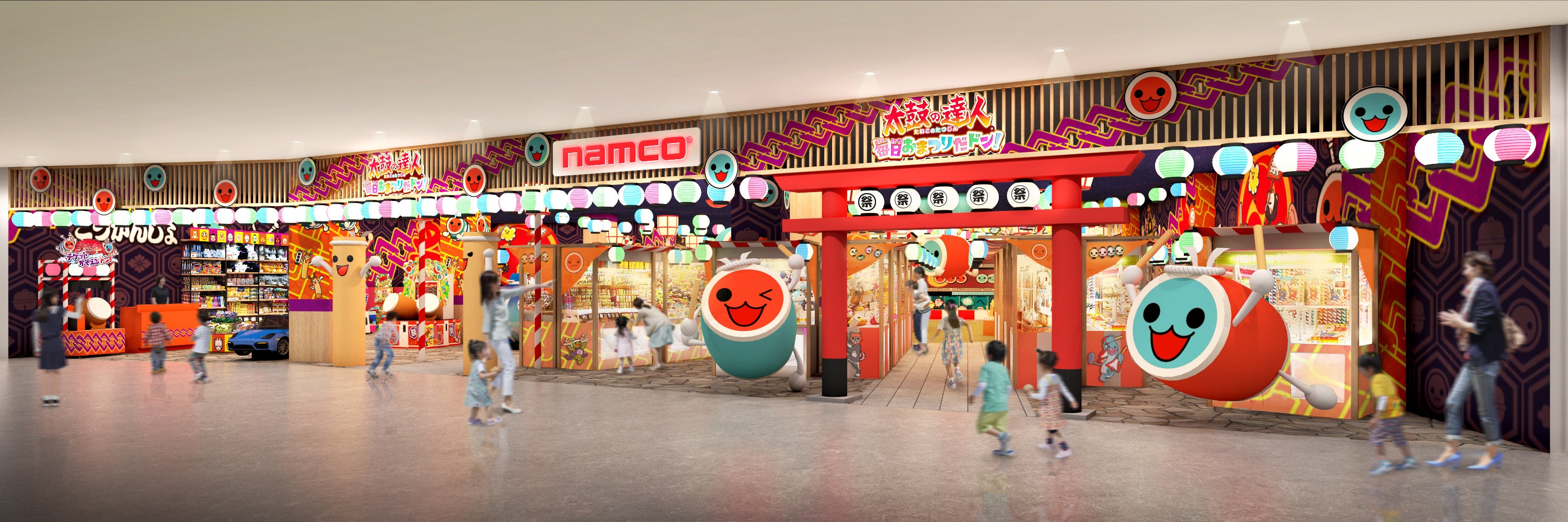 『namco太鼓の達人毎日おまつりだドン!ららぽーと堺店』は国民的音楽ゲーム『太鼓の達人』の世界観を用いて、堺の街や地域のお祭りを表現した日本初展開の新しいアミューズメントエリアです。