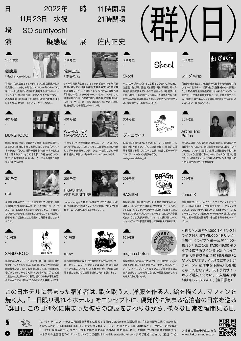 2022年11月23日(水・祝)に福岡県博多区の宿泊施設LEBERATED HOTEL SO SUMIYOSHIを舞台に、文化と食と音楽の日「群日」と冠したイベントを行います。