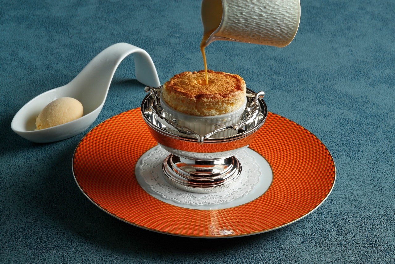 デザートには、20分ほどかけて作り上げる温製スフレをご用意。薬草系のリキュール“シャルトリューズ”の香りをつけたソースと合わせてお召し上がりいただきます。