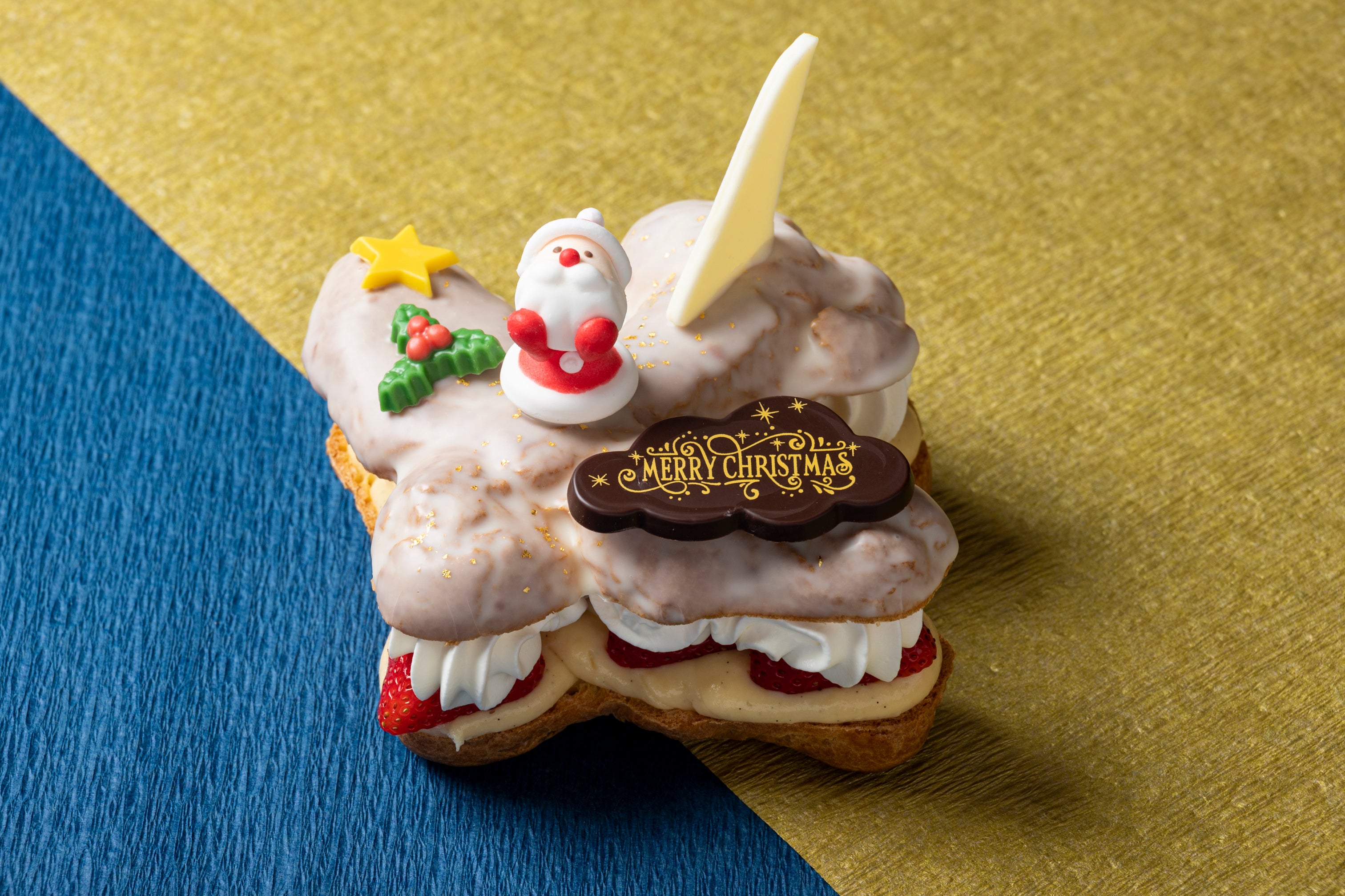 飛行機型のシュー生地にカスタードクリーム、生クリーム、フルーツをサンドした人気の飛行機シューをクリスマス仕様に飾り付けました。