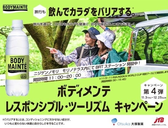 大塚製薬株式会社(本社:東京都、以下「大塚製薬」)と、株式会社JTB(本社:東京都、以下「JTB」)は、旅行者に健康で楽しい旅行を演出する「ボディメンテ レスポンシブル・ツーリズム(以下BRT)」キャンペーン第4弾を2022年11月3日より兵庫県・淡路島にて実施します。近年、旅行者も訪問地での地域の生活や環境に配慮した責任ある行動をとる「レスポンシブル・ツーリズム(責任ある観光)」*が注目されています。現在の社会的状況から、旅行者を受け入れる地域や観光関連事業者が様々な対策を講じることに加え、旅行者自身も健康や現地の文化・環境などに留意し、双方各場面において行動に責任を持つことが求められています。旅行先でも責任ある行動をとることは、旅先の地域資源守り、育むサステナブルツーリズムにも通じます。