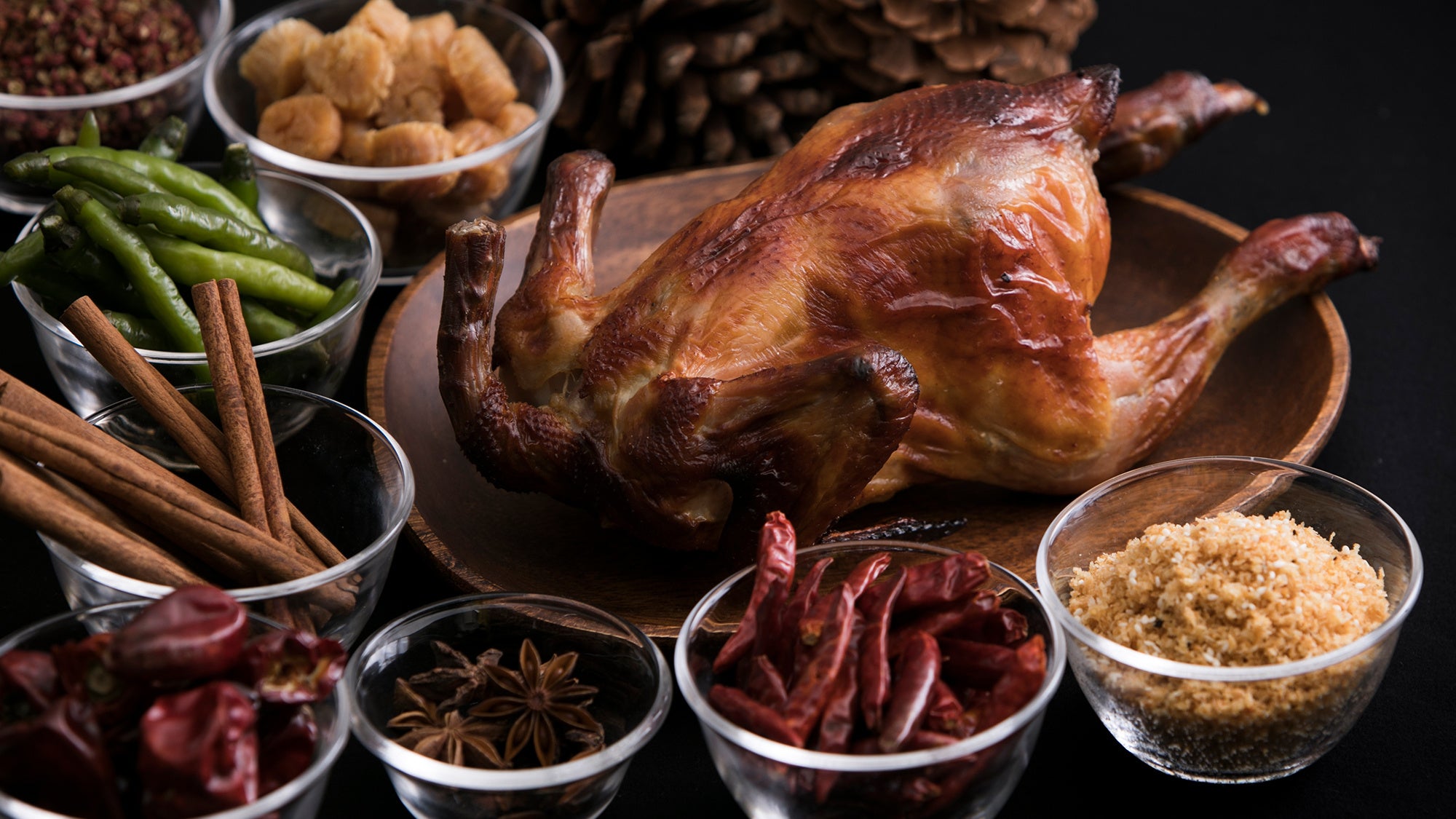 中華風のスパイスで味付けした宮崎県産鶏をジューシーに焼き上げたローストチキンをご自宅でいかがですか?鶏本来の味と「藍海オリジナルのピリ辛調味料」をつけた味の食べ比べもお楽しみください。