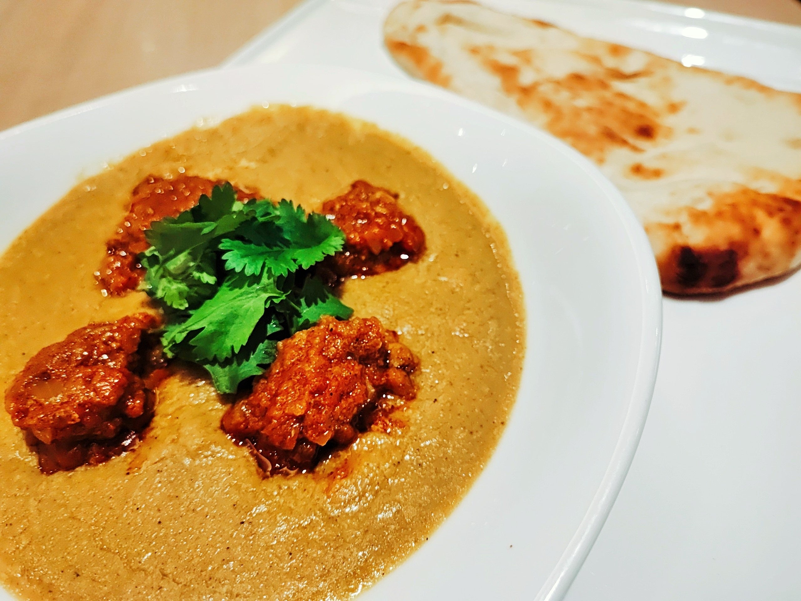 ホテルヴィスキオ尼崎ではこちらのカレーに、クミンやコリアンダー等スパイスを効かせトマトベースのソースで仕上げたスパイシーチキンを合わせ、ナンと一緒に召し上がっていただきます。