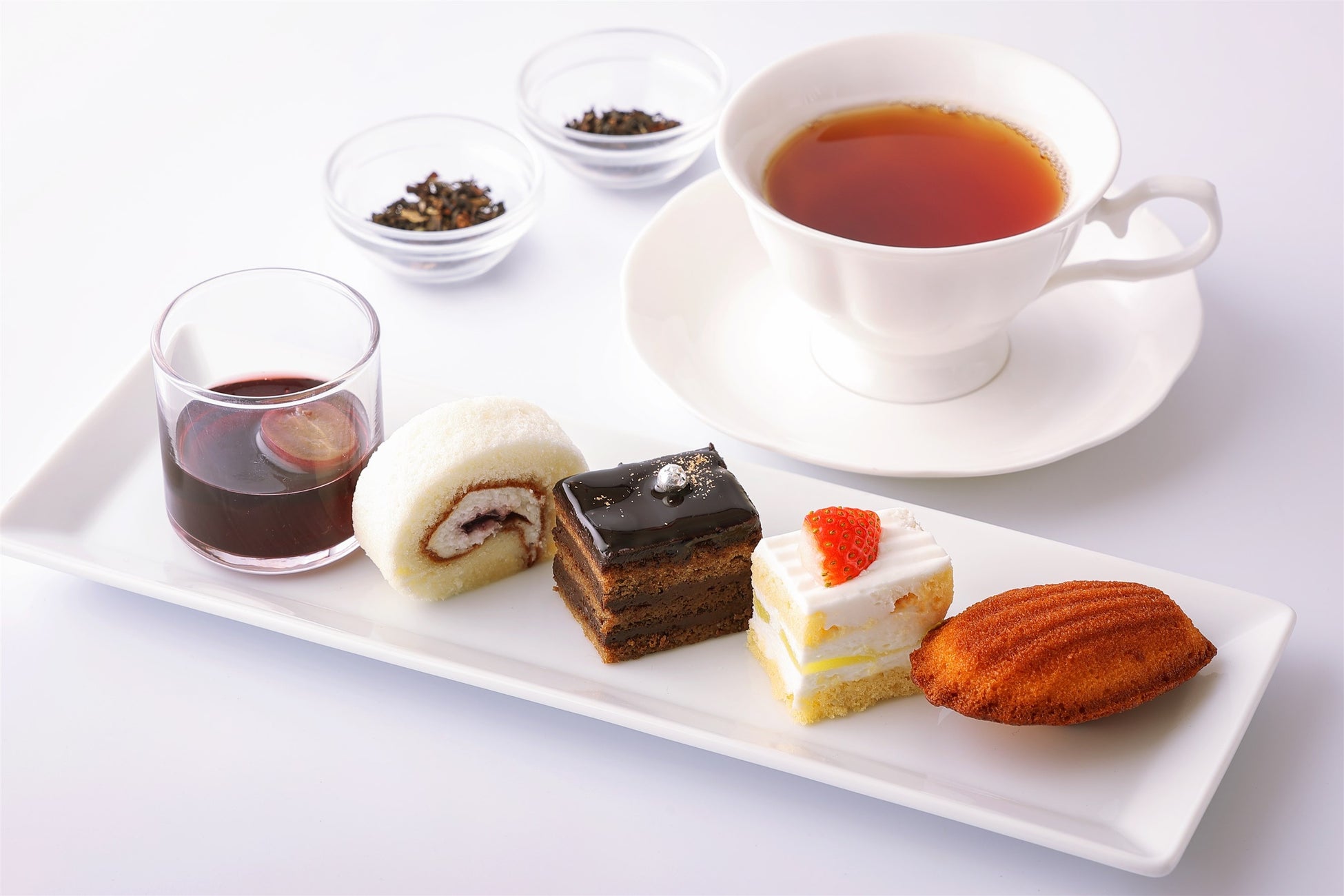 デザートには“ニューオータニが贈るSATSUKIスイーツ 5種の甘美”を。ニューオータニが誇るパティスリーSATSUKIの人気のケーキをかわいらしいミニサイズでご堪能いただけます。食後の紅茶も厳選したものをご用意いたしました。アッサム・ダージリン・ニルギリ・季節のリーフティーの4種からお好みやその日の気分でお選びいただけます。
